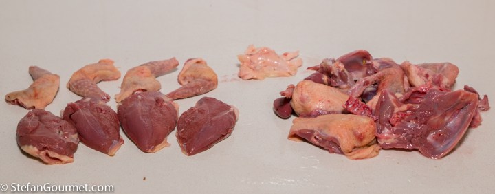Cut the carcasses into pieces and reserve. Separate the fat.