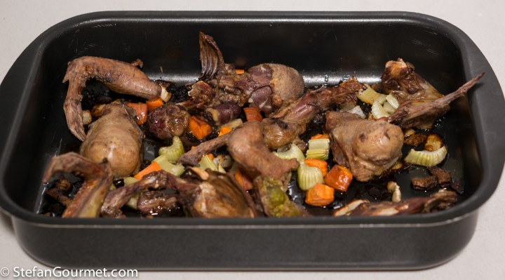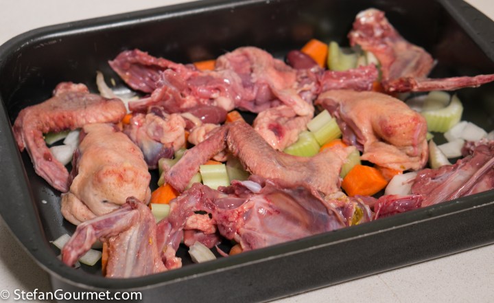Preheat the oven to 190C/375F. To make the jus, put the carcasses in an oven dish together with chopped onion, celery, and carrot.