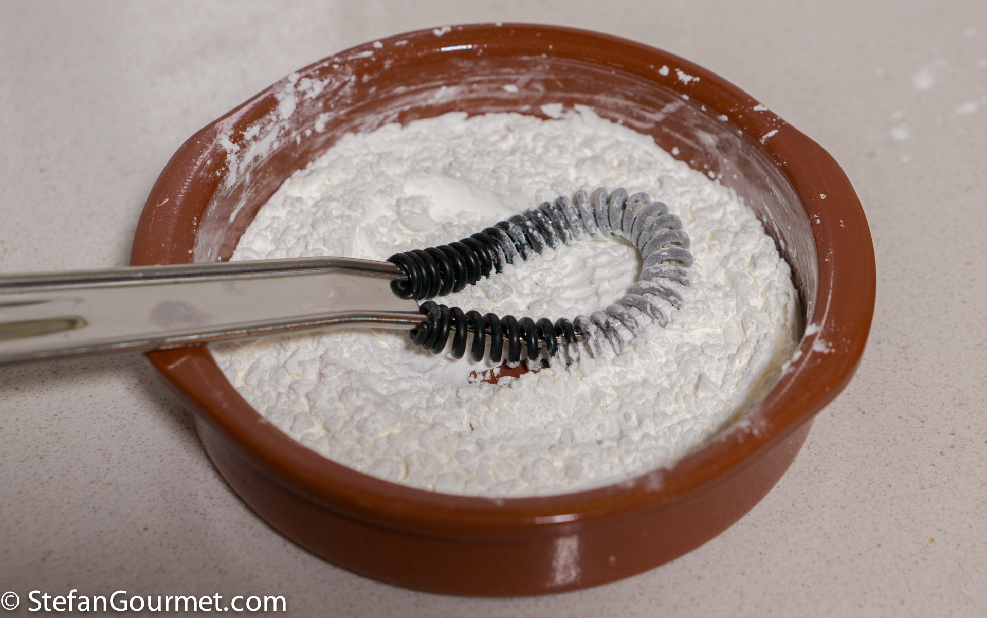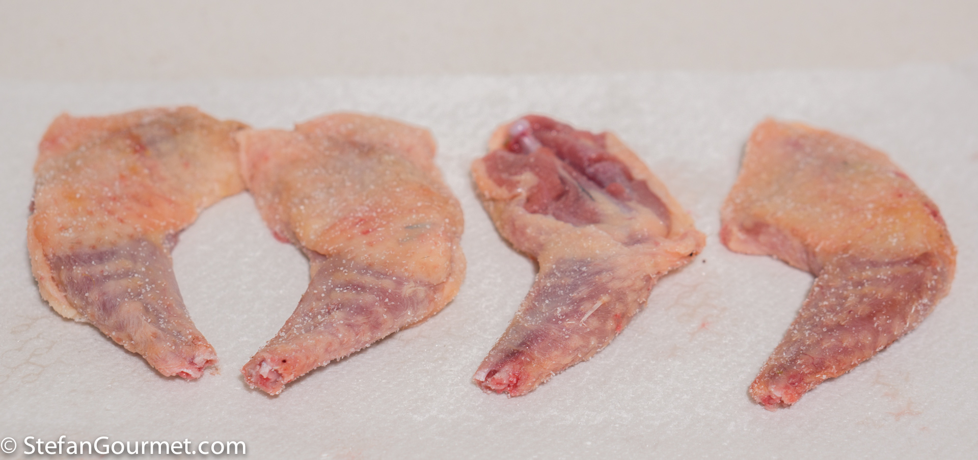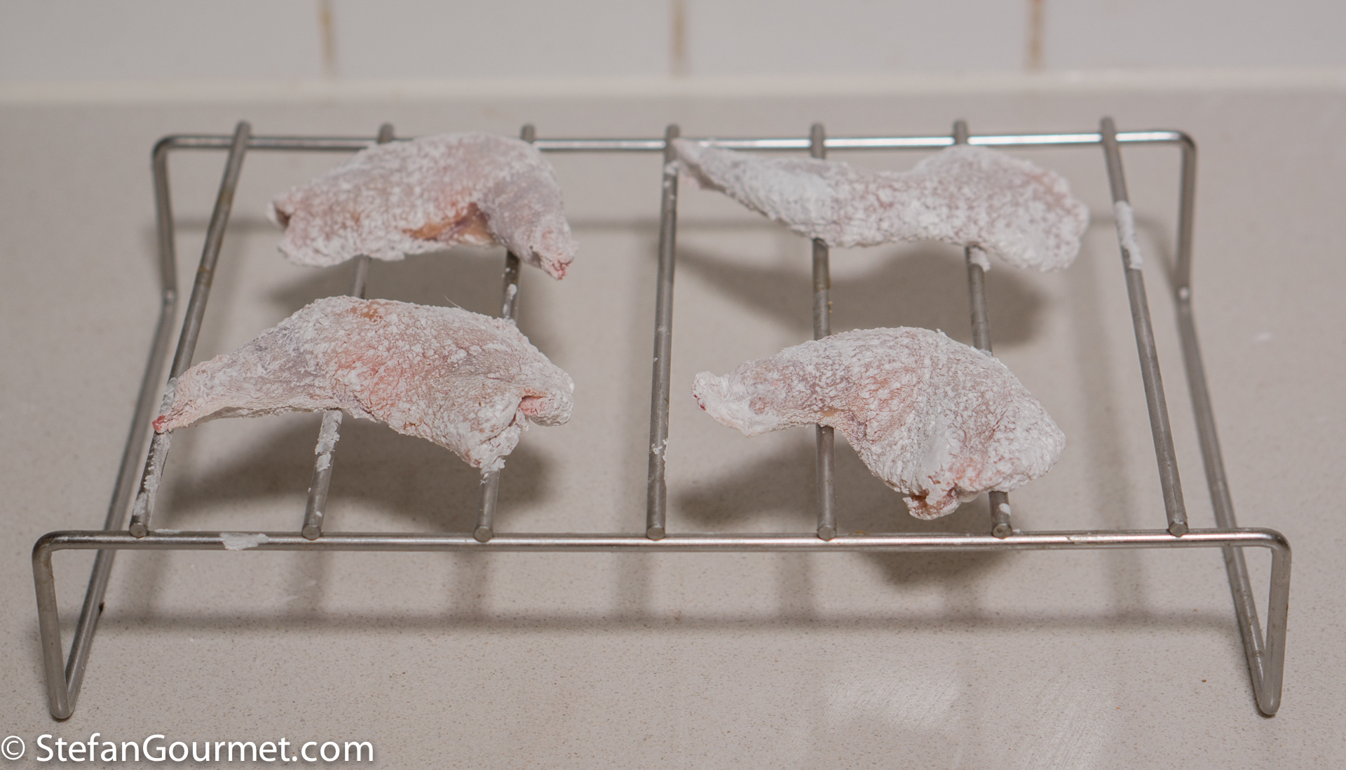 Shake off excess corn starch and arrange the legs on a wire rack. Allow them to dry in the refrigerator for at least an hour.