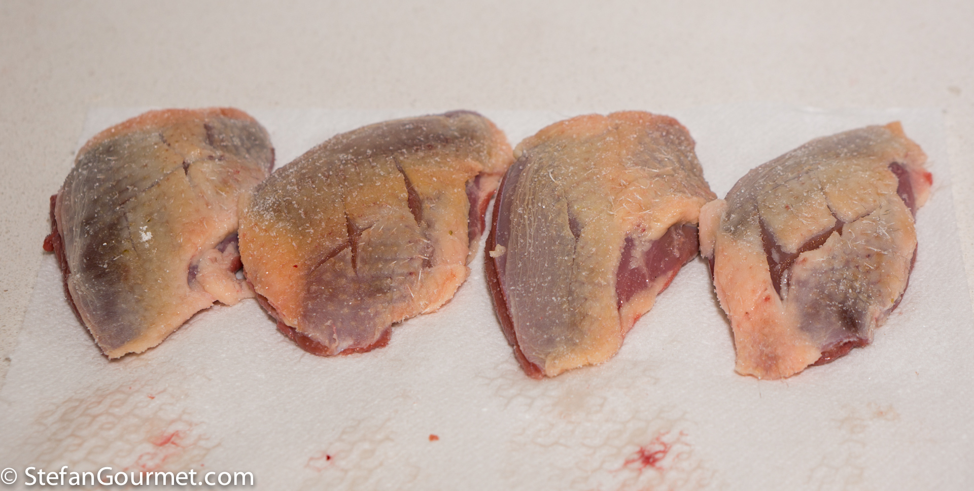 Score the breast fillets on the skin side (try not to cut into the meat) and season with salt.