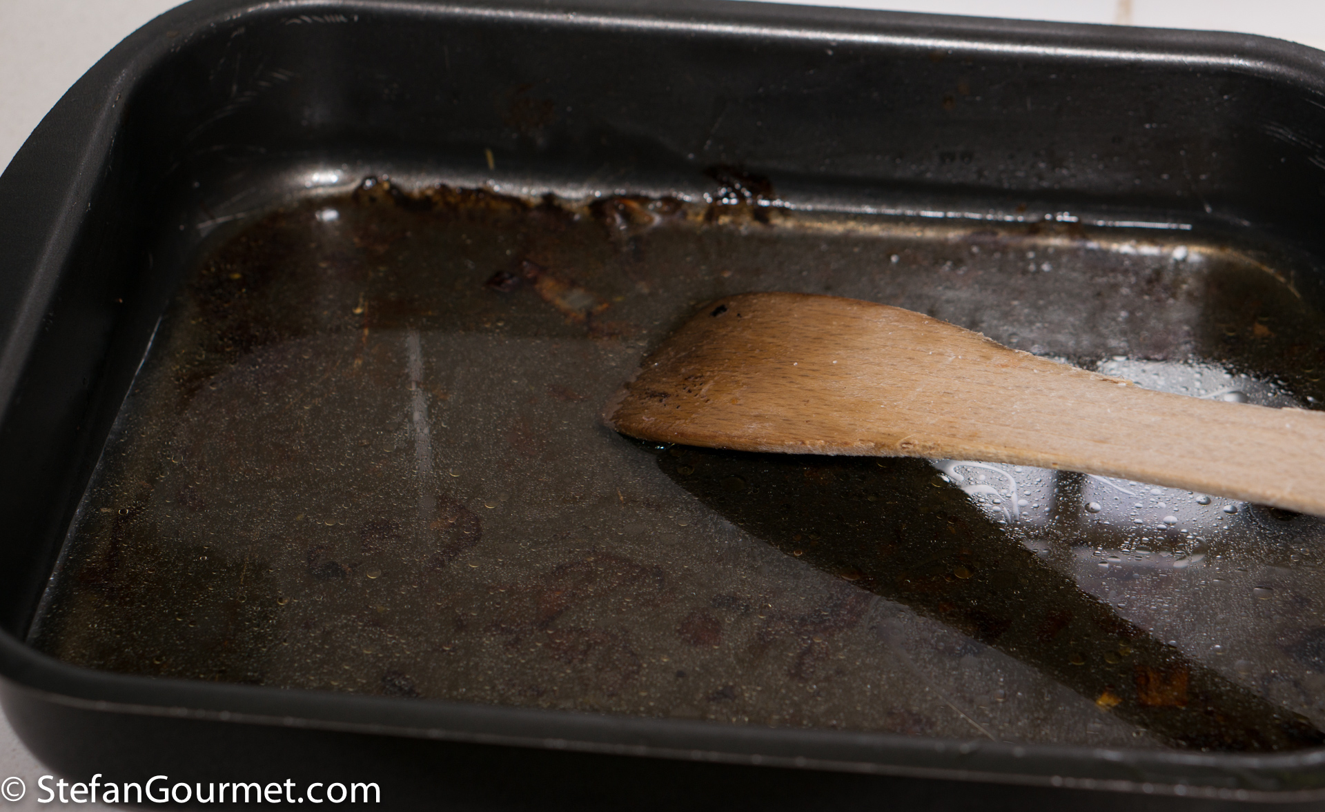 Put the carcasses and vegetables in a pot. Deglaze the roasting dish with water and use a wooden spatula to loosen any browned bits that got stuck to the roasting tray.