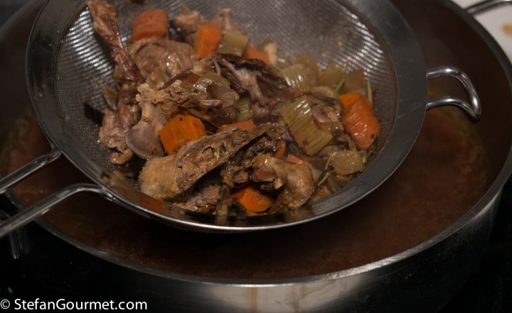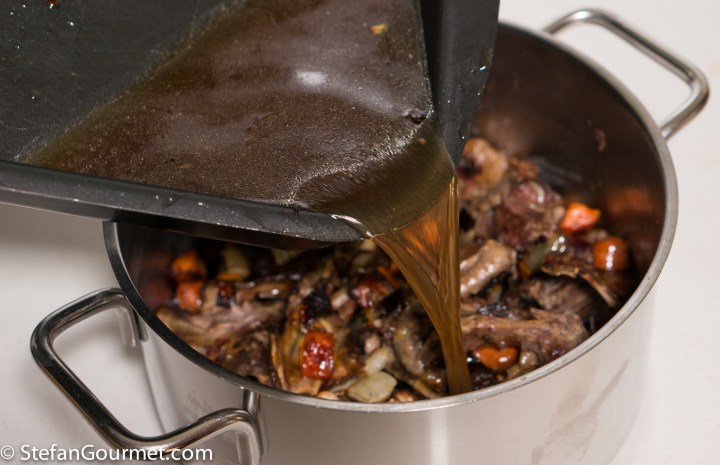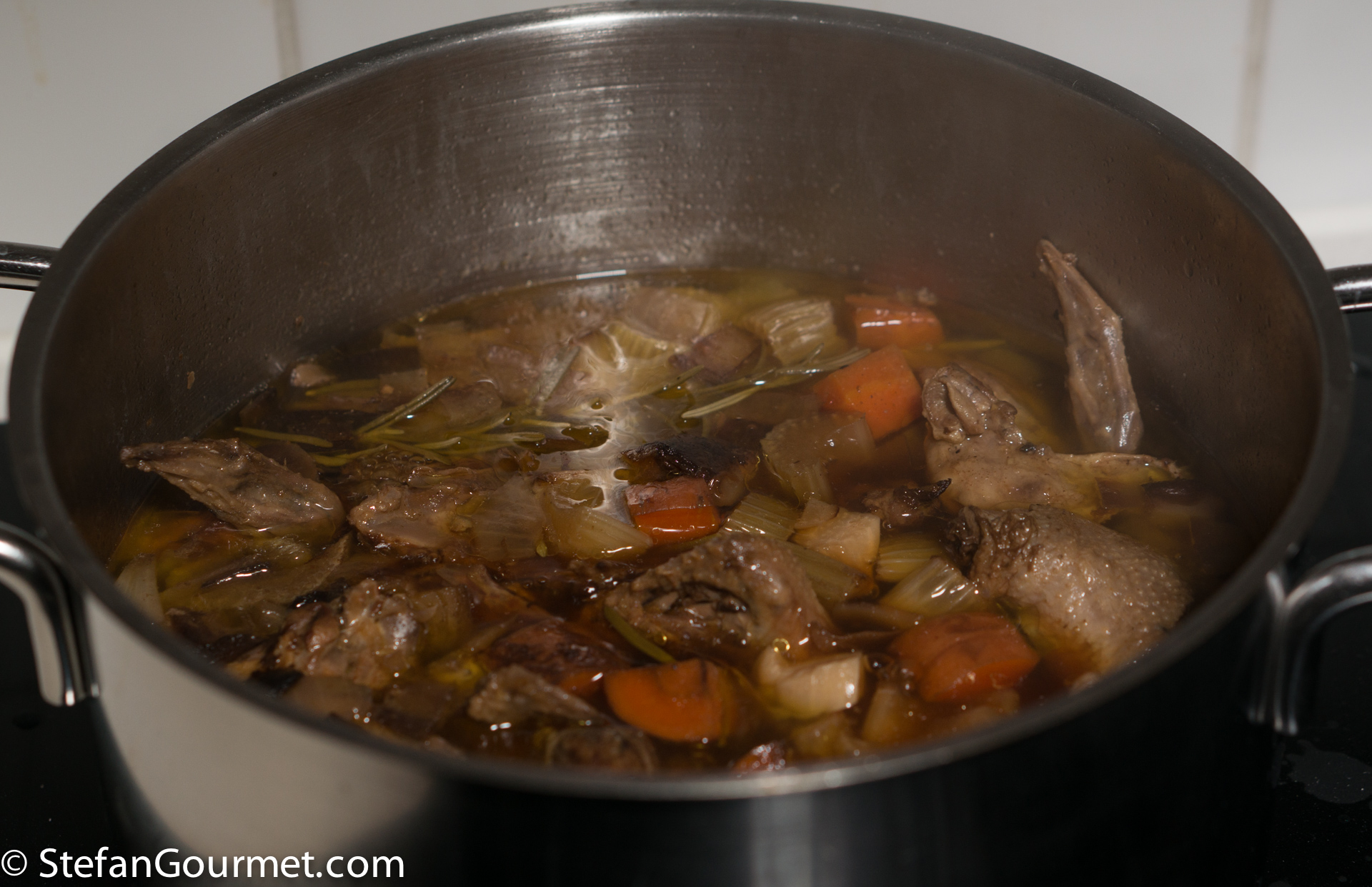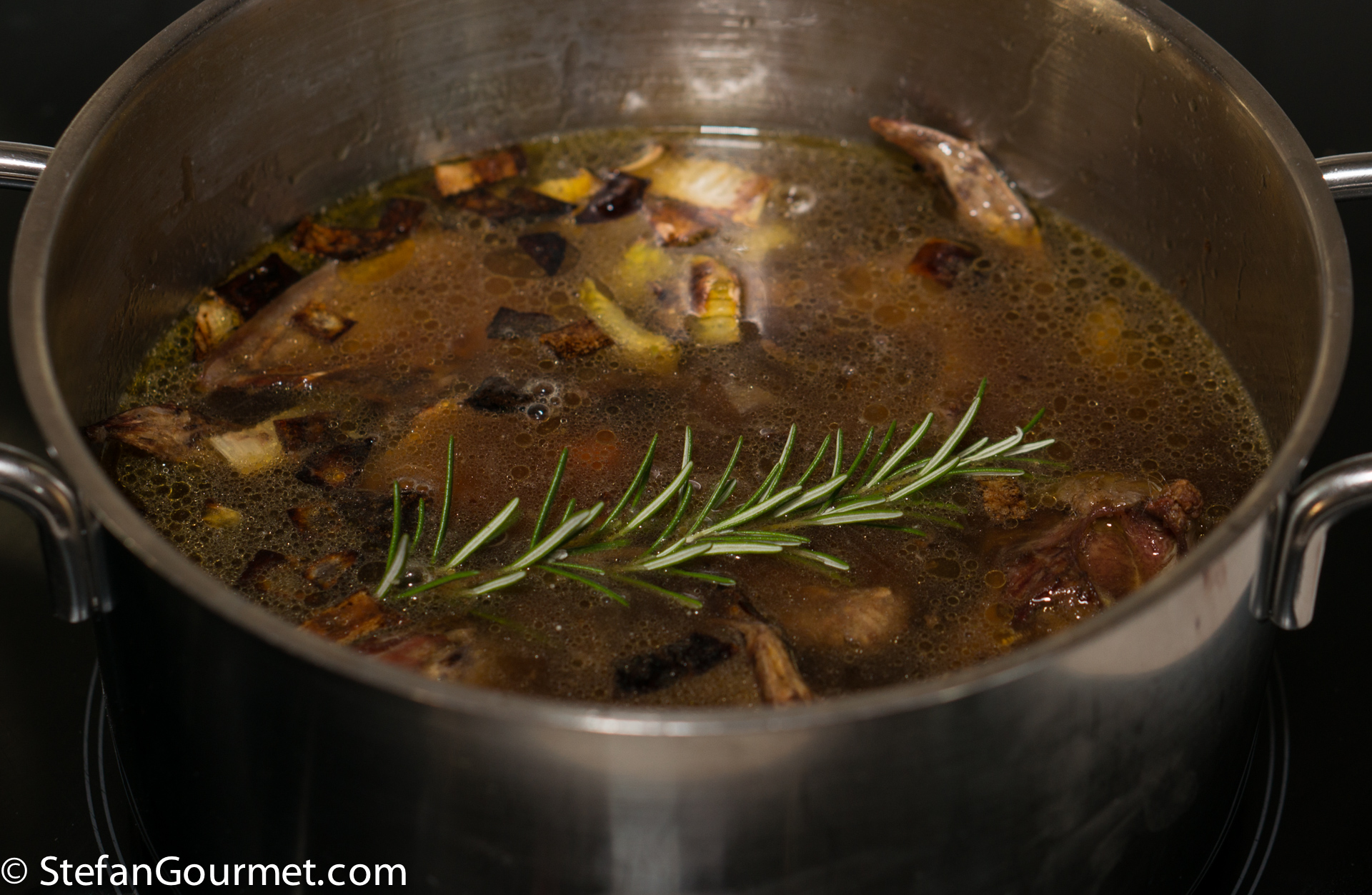 Add this water to the pot with the carcasses and vegetables. Add just enough water to cover.