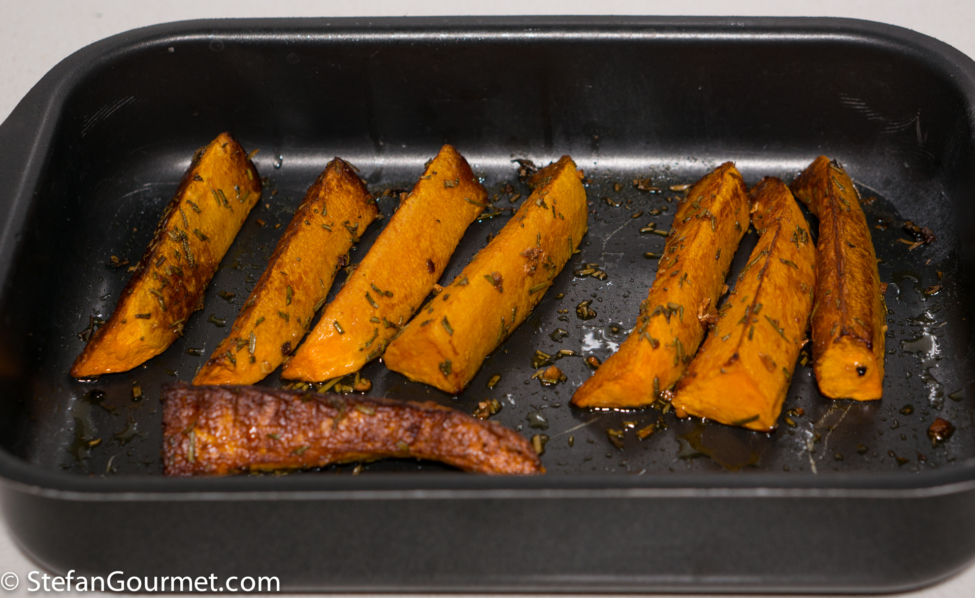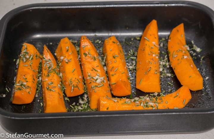 Preheat the oven to 225C/440F. Peel the butternut squash and cut it into 8 wedges. Toss the squash with a tablespoon of minced rosemary, a minced glove of garlic, and some extra virgin olive oil.
