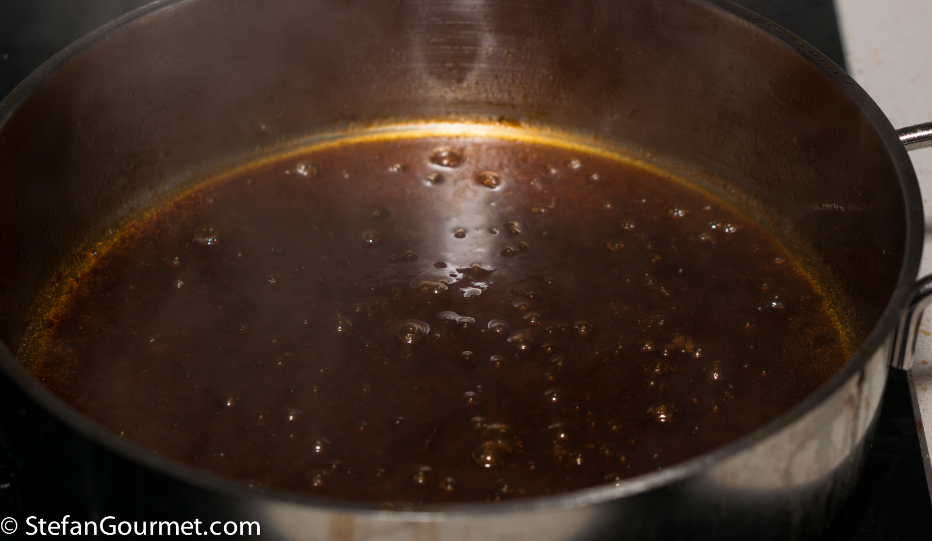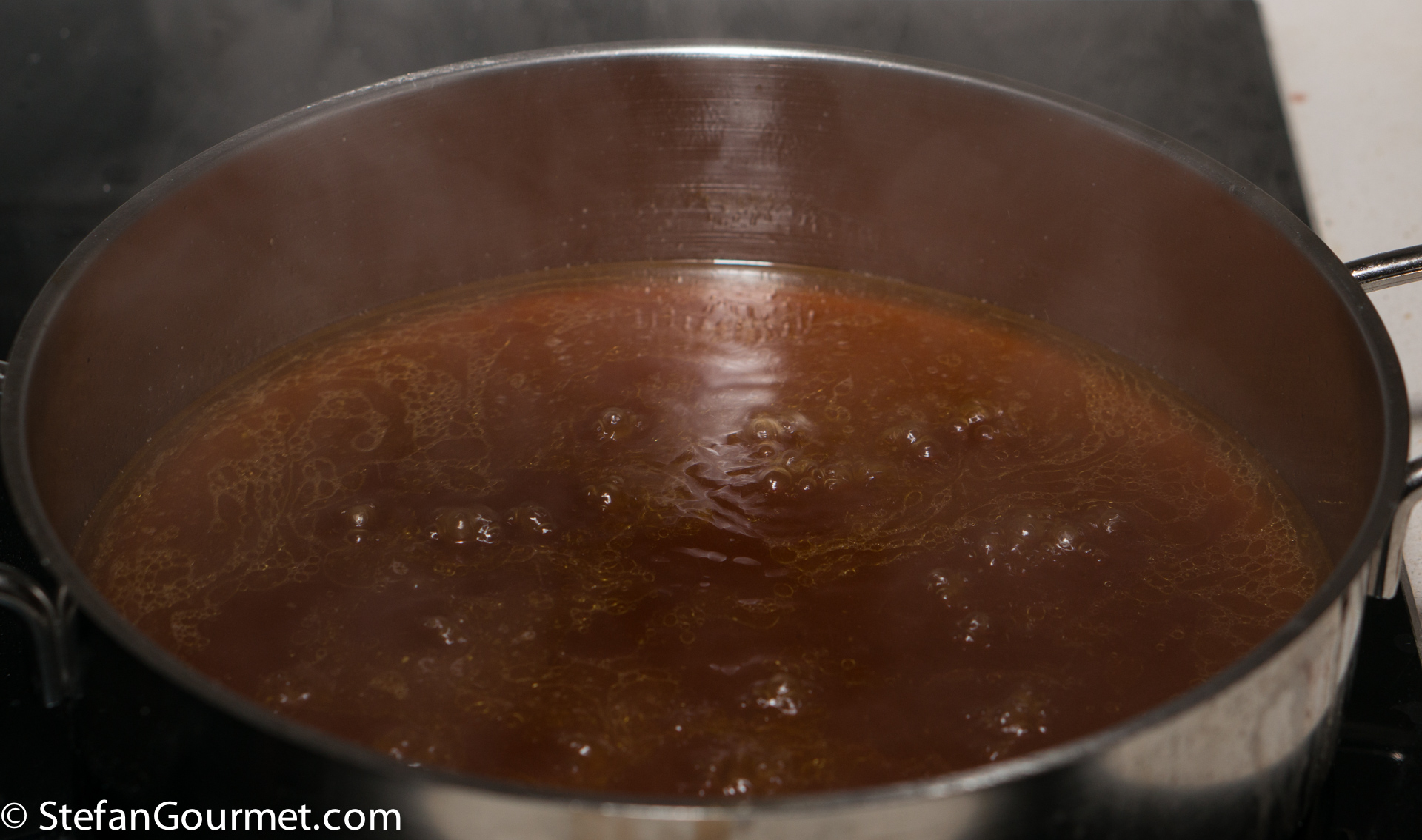 Simmer until the stock has been reduced to a thick jus. Taste and adjust the seasoning with salt and freshly ground black pepper.