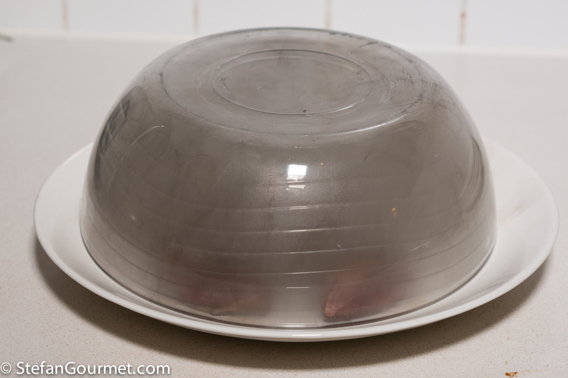 …and quickly cover the plate with a large bowl so the smoke will remain underneath. If the smoke subsides, re-ignite the rosemary after 5 minutes. The total smoking time is about 10 minutes.