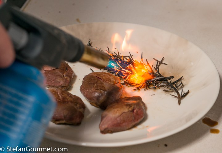 To smoke the breast fillets, arrange them on a preheated plate and put some rosemary next to it. Ignite the rosemary with a blowtorch…