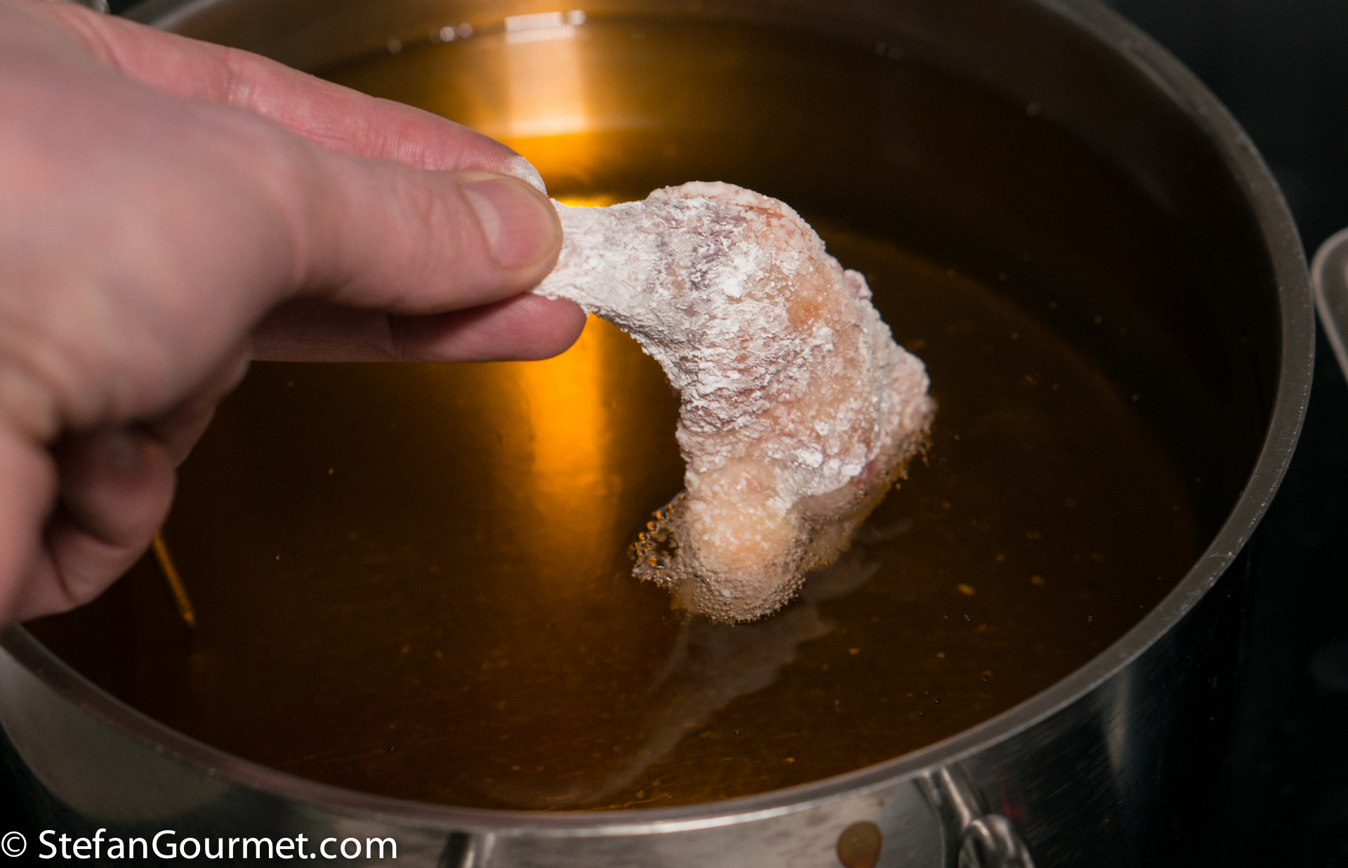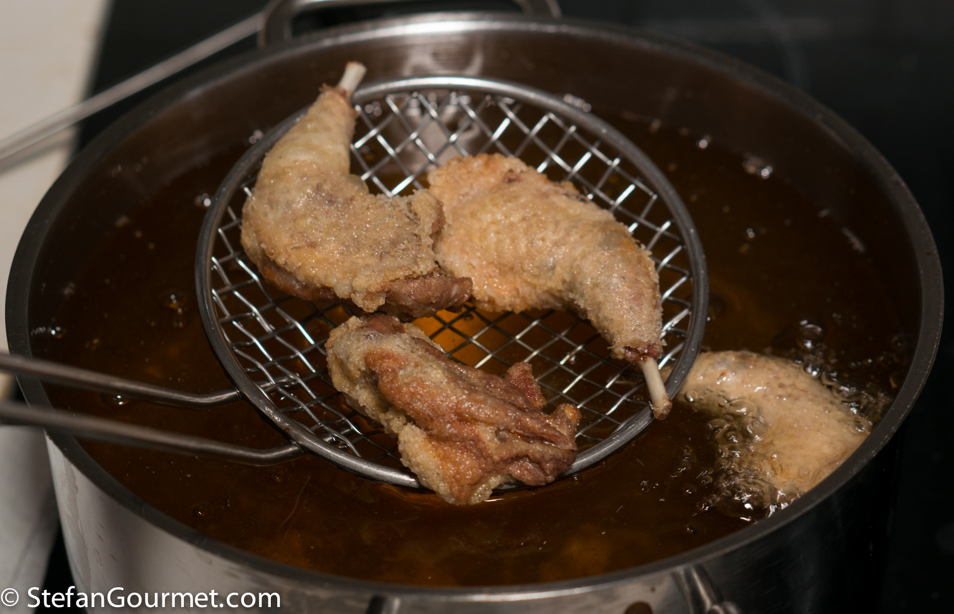 In the meantime, deep fry the legs in oil at 180C/350F…