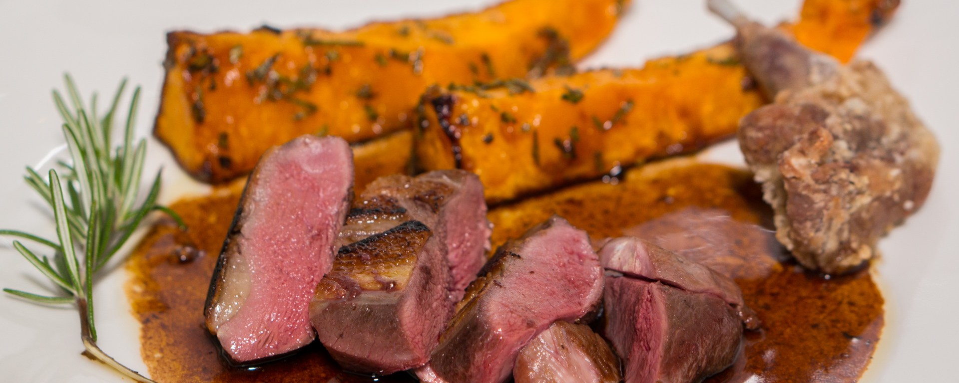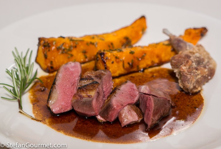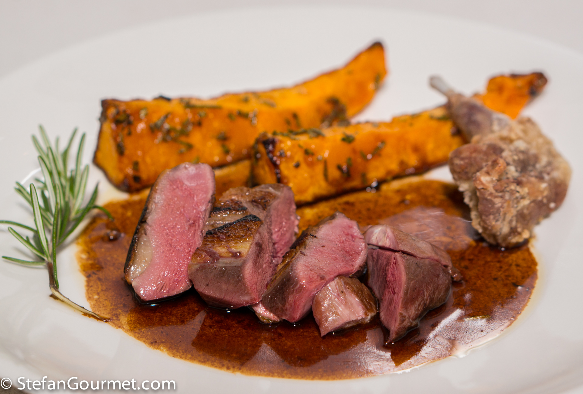 Slice up the smoked breast fillets. First put some jus on each preheated plate (preheated to about 100C/220F, not higher, as otherwise the jus will boil) and then the sliced up breast fillet, 2 squash wedges, and a deep fried leg. Serve at once.