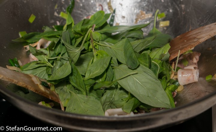 Use the vegetable peeler or a mandoline to shave the ginger (I peeled it first, but at the restaurant they didn’t bother). Slice the chilli pepper into thin rings. Slice the white and light green part of the scallions into rounds and the green part into pieces of about 4 cm (1.5″). Use just the basil leaves and discard the stems (again at the restaurant they didn’t bother).