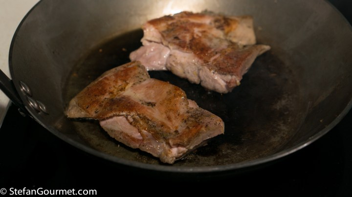 Heat 2 tablespoons of olive oil over high heat. When the oil is hot, brown the turkey on both sides over high heat. Not more than 1 minute per side, as you don’t want to overcook the turkey (which is already cooked).