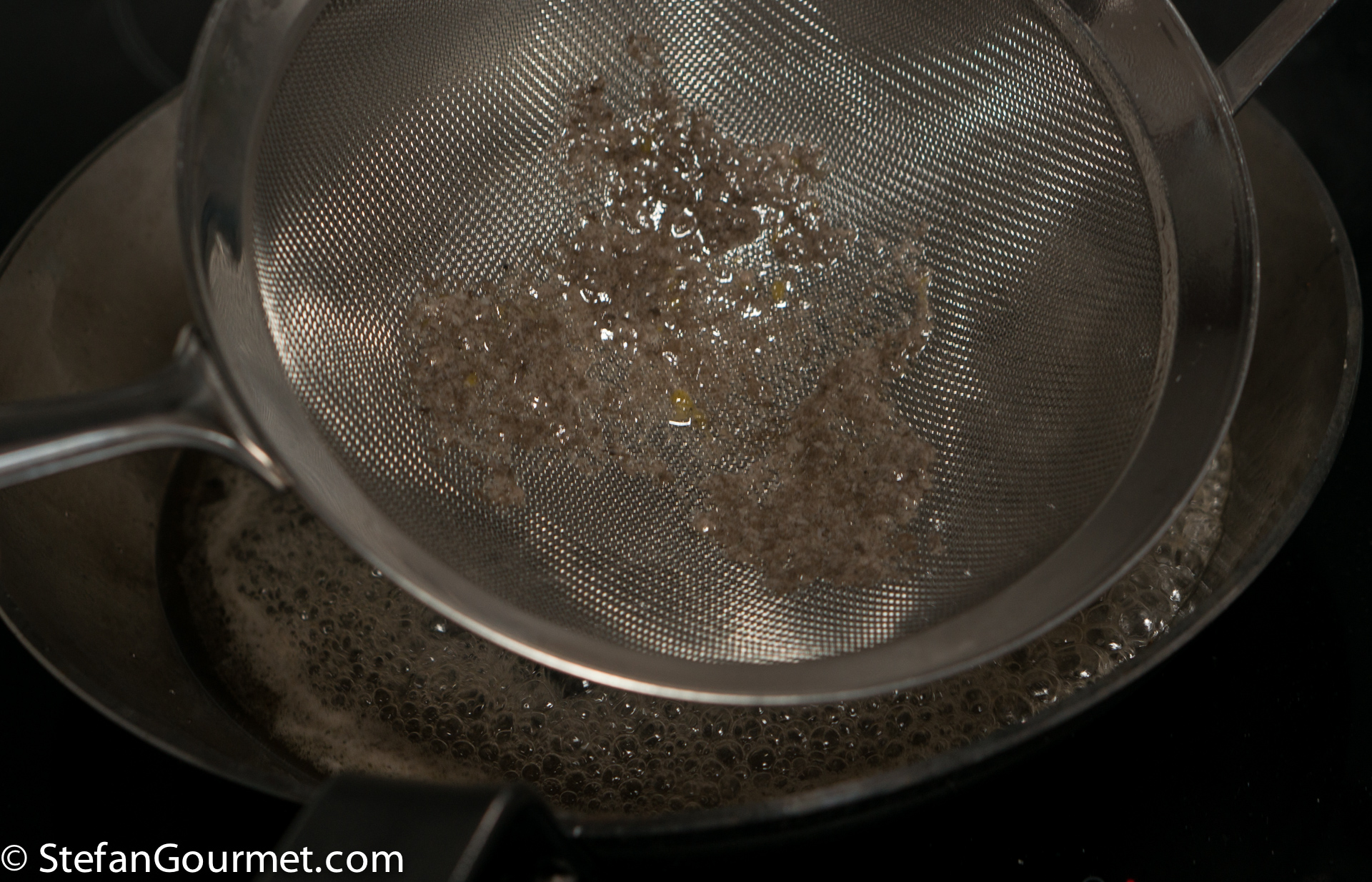 Take the turkey out of the pan. Strain the juices through a fine sieve directly into the pan.