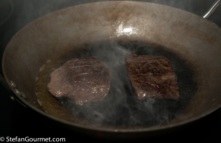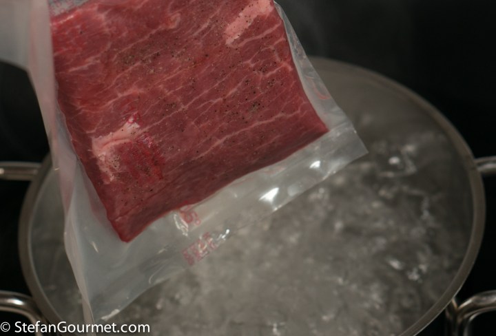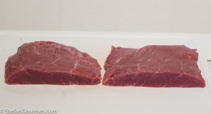 To avoid food safety issues, I scalded both pieces in boiling water for 20 seconds after vacuum sealing. (In the experiment six years ago I seared the beef before vacuum sealing, but since then I have developed the scaling technique that is a lot safer.) Especially 39C/103F is a temperature that pathogens thrive at, so it this is a good precaution.
