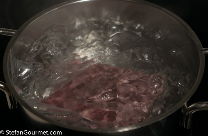 Even though this step wasn’t really necessary for food safety reasons for the piece to be cooked at 55C/131F, I scalded both pieces to keep the experiment on equal footing.
