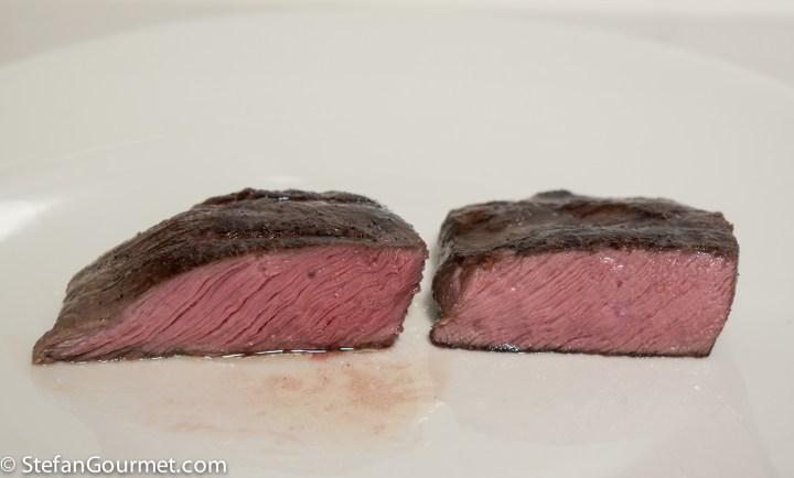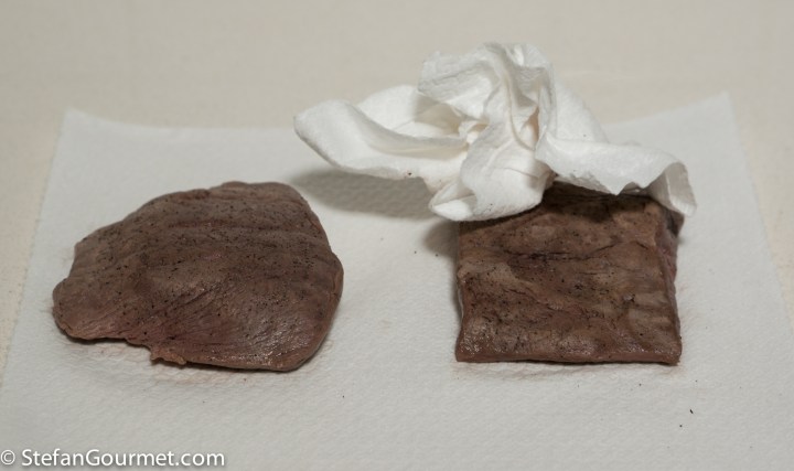 The warm aged piece is on the left, the other on the right. The difference was clearly visible and even more clear to taste. I knew which was which, but my guinea pig Kees did not. He thought (and I agreed) that the piece that I later revealed to him as the warm aged piece was more juicy and had a better texture. The other piece was softer, but a bit too soft. The tenderizing that happens at 55C/131F is a different type of tenderizing than what happens by the enzymes at lower temperatures. The warm aged piece was not more tender than the piece without warm aging, but the texture was definitely better.