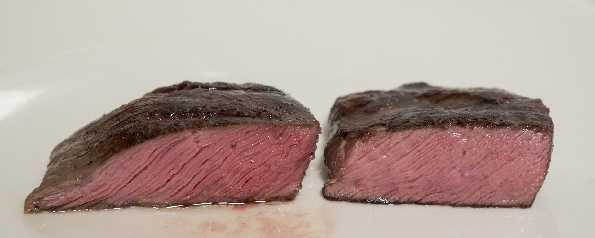 Although I believe that both cases are not fully comparable, there is some merit in the fact that if you have 4 hours to cook beef, it makes the most sense to find out what will give the better result: all 4 hours at 55C/131F, or half at warm aging and half at cooking. But still I thought the difference between cooking at 55C/131F for 2 or 4 hours would be too large (because in my opinion no actual cooking occurs at warm aging temperatures), and so I came up with an alternative experiment and that is to use flat iron steak/blade steak.