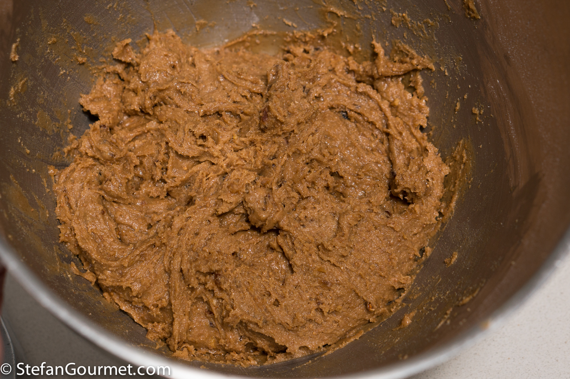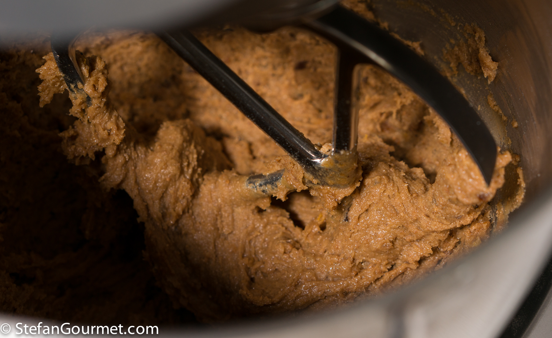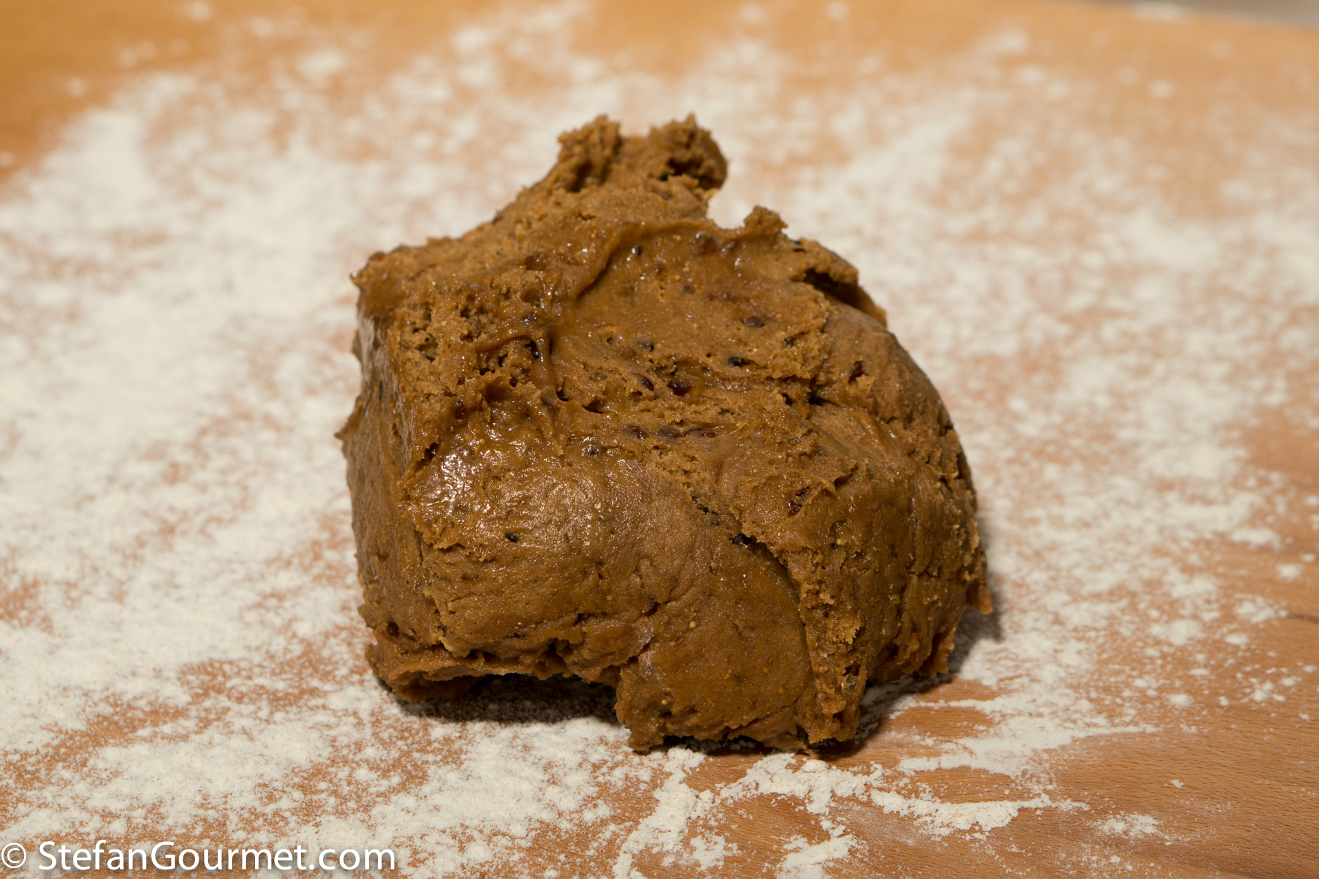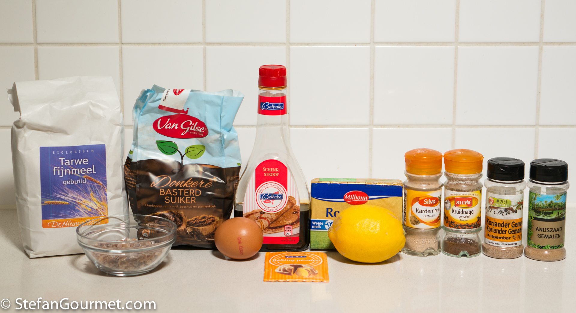 The original German recipe calls for the old-fashioned rising agents Pottasche (potassium carbonate) and Hirschhornsalz (ammonium carbonate), which I replaced with baking powder. Two types of flour are used: wheat flour type “1050” (in Dutch: gebuilde bloem) and rye flour type “1150”. These are also old-fashioned types of flour, from which the germ and bran have not been sieved as carefully as from today’s all-purpose flour. To approximate this, you can mix equal parts of all-purpose flour and wholewheat flour.