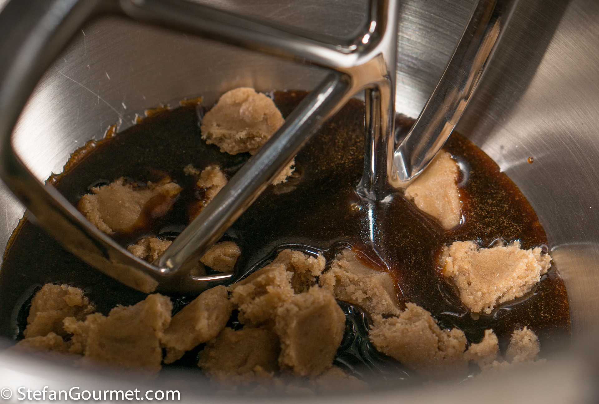 Stir until the butter has melted. Allow this mixture to cool somewhat (to less than 60C/140F).