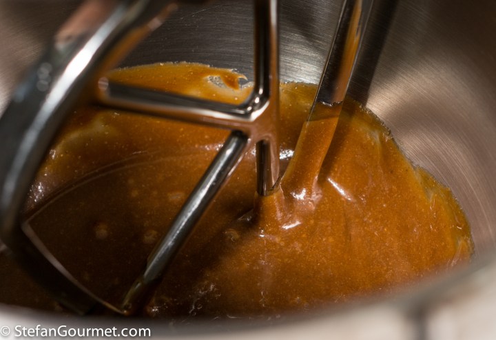 Pour the syrup mixture into the bowl of a mixer.