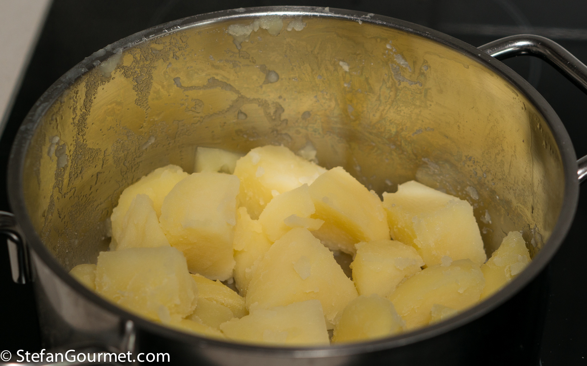 Drain the potatoes and put the pot over low heat to allow to dry them for a minute.