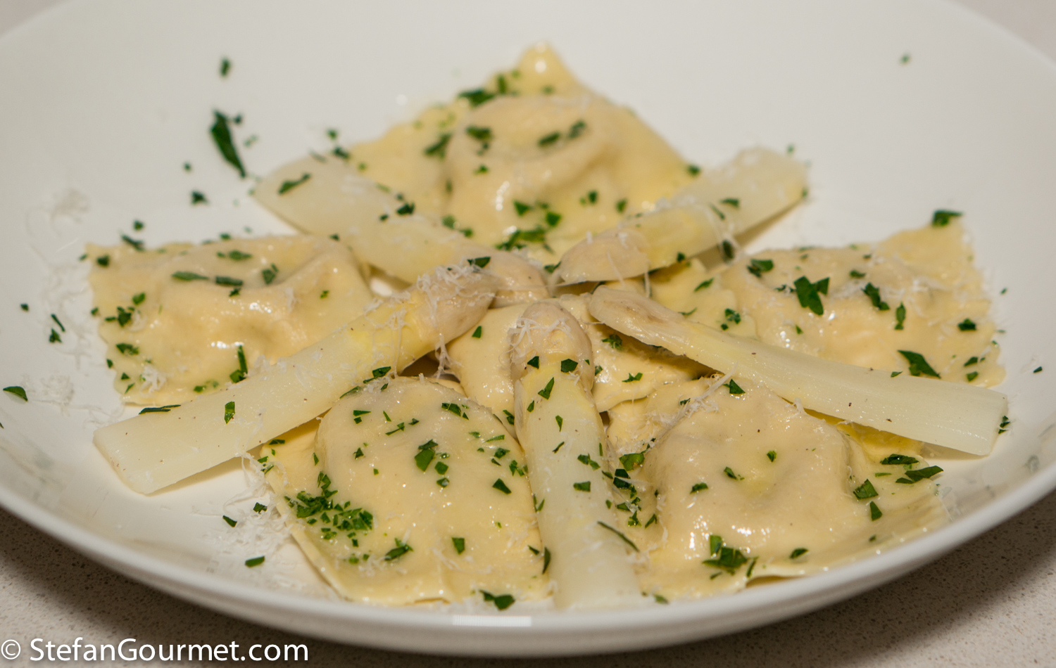 White asparagus are still in season here, and these white asparagus ravioli are a great way to serve them.
