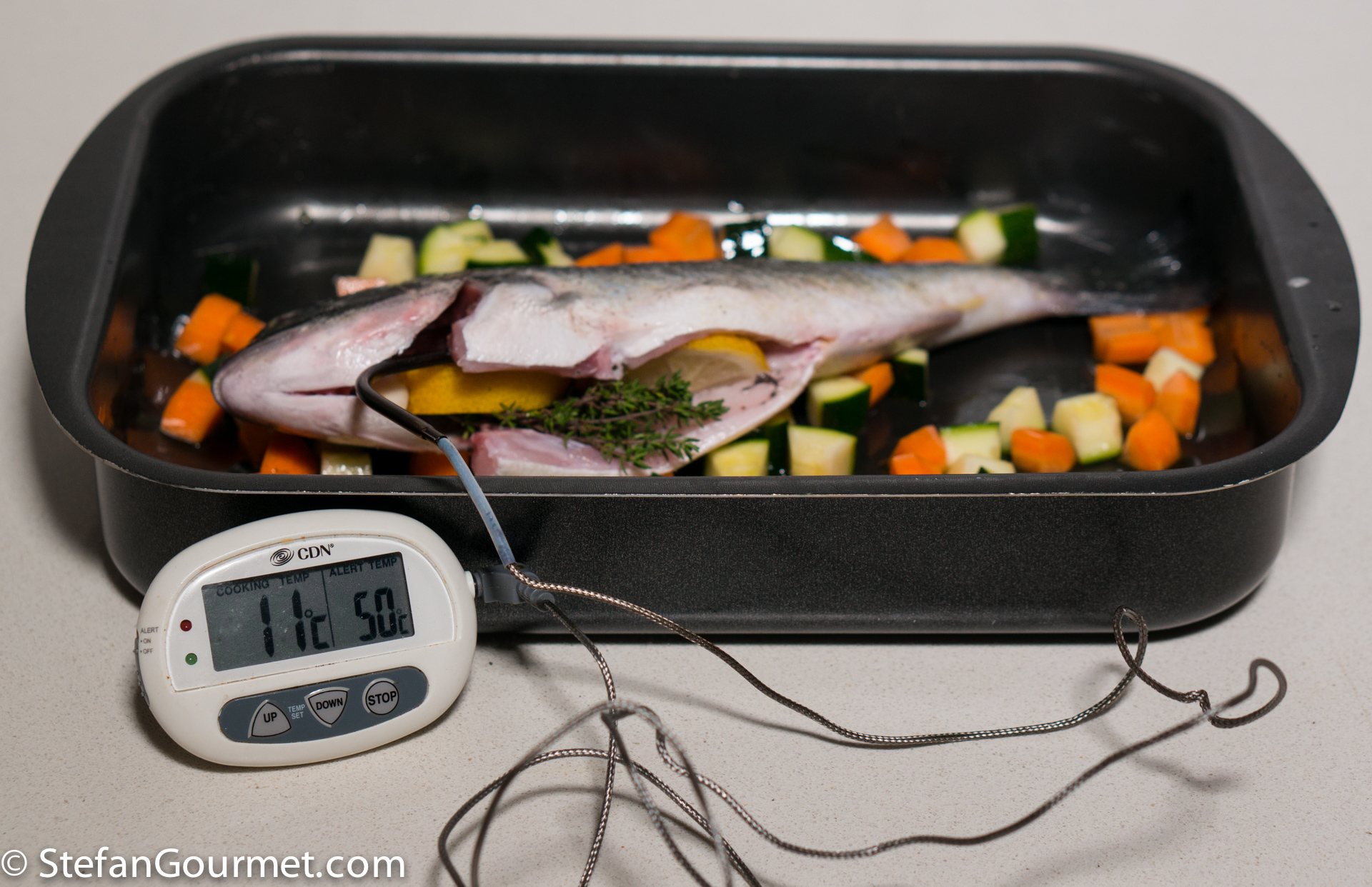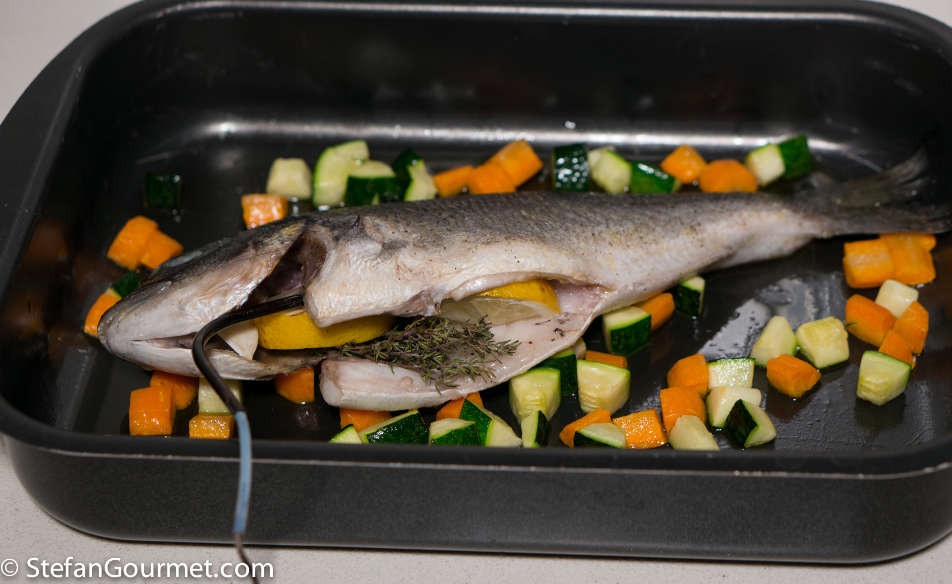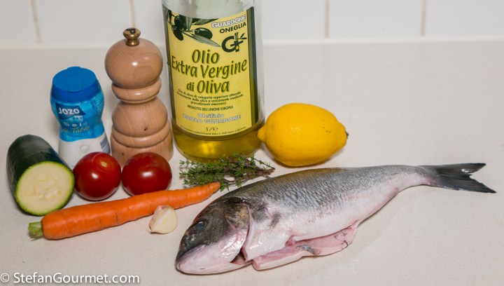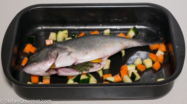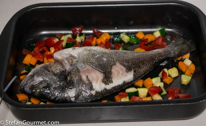 This is how sea bream (daurade) was served to us in Corsica: cooked in the oven with some colorful vegetables. When ordering fish on Corsica, be careful about the price. On the menu this daurade was listed as 12 euros per 100 grams. We shared an 800 gram fish, which set us back 96 euros. So it makes a lot of sense to make this at home instead, as it is quite easy as long as you use a thermometer. Sea bream overcooks very easily and will then become dry and boring. With a thermometer you can’t overcook it.