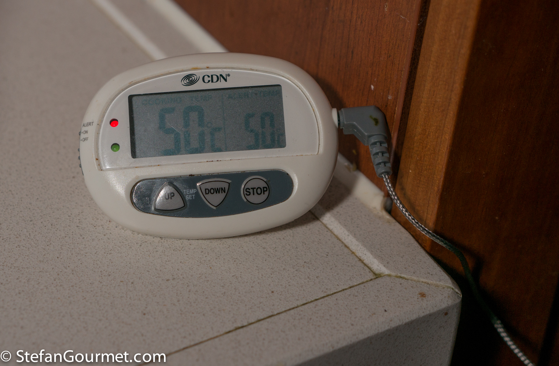 Insert the probe of an instant-read thermometer into the fish, such that the tip of the probe is in the center of the thickest part of the fish.