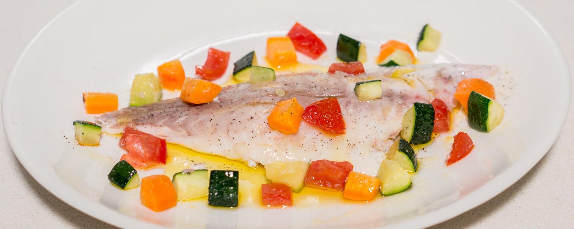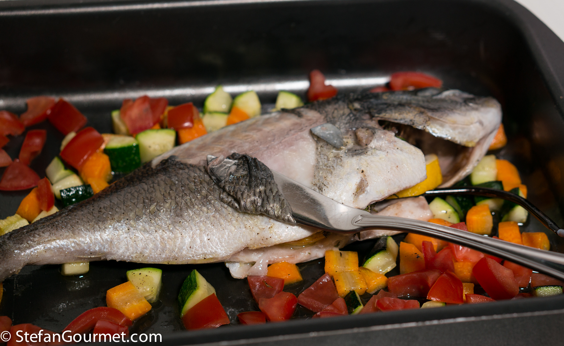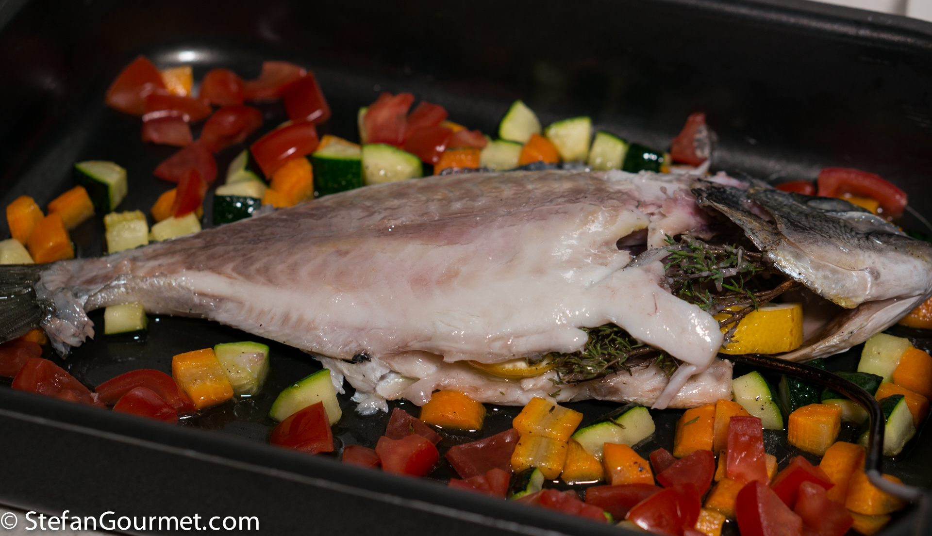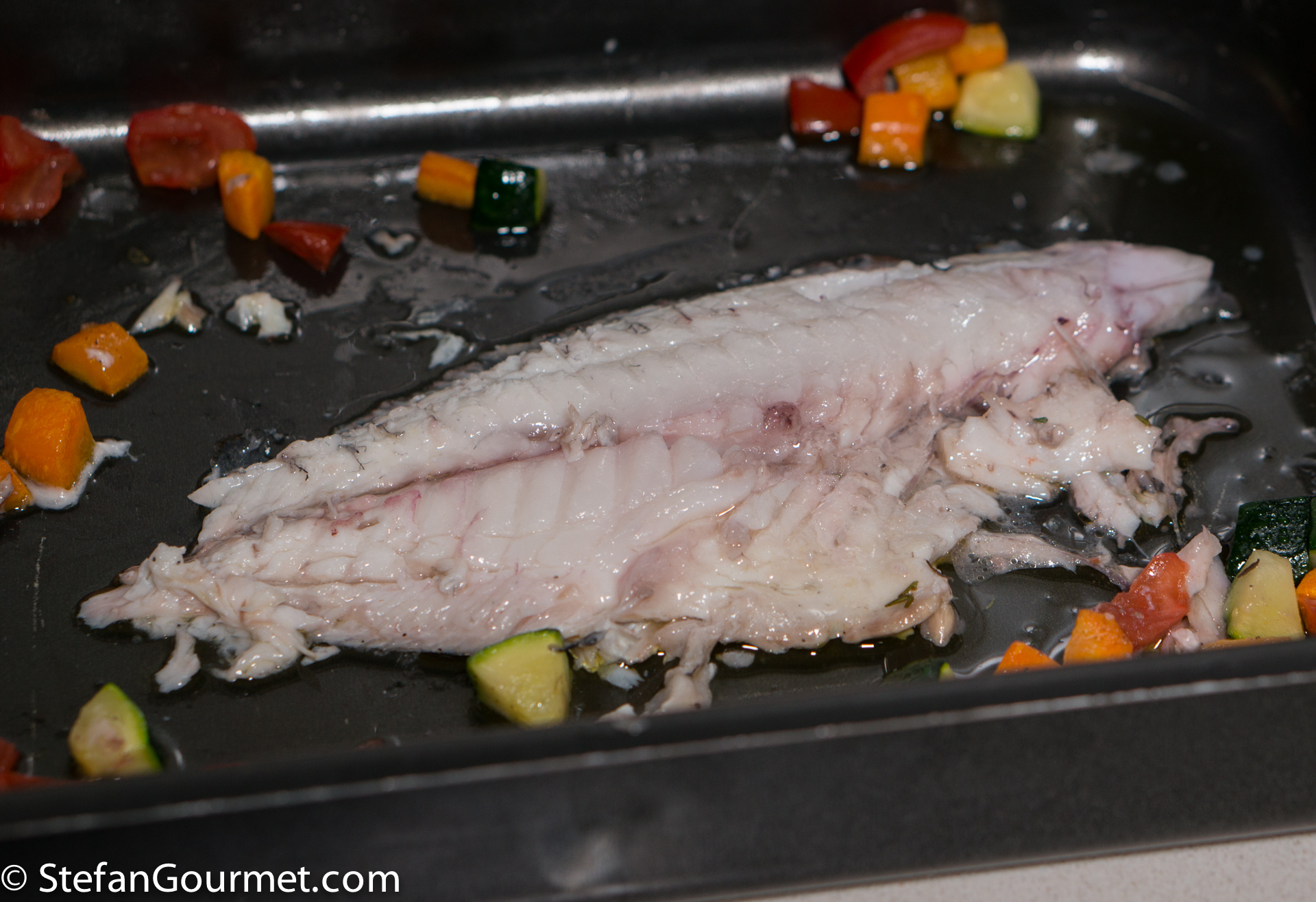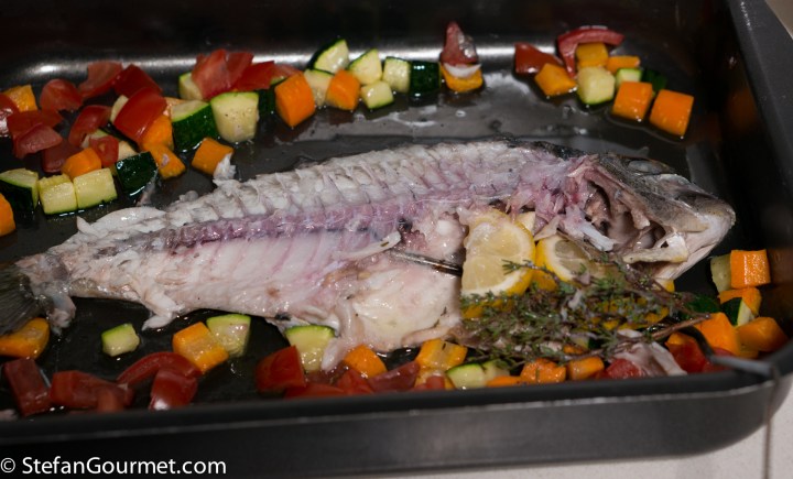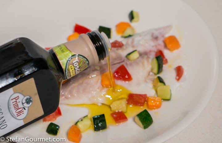 Arrange the vegetables on and around the fish, and drizzle with good quality extra virgin olive oil. The olive oil should be fragrant, if not then buy a better one.