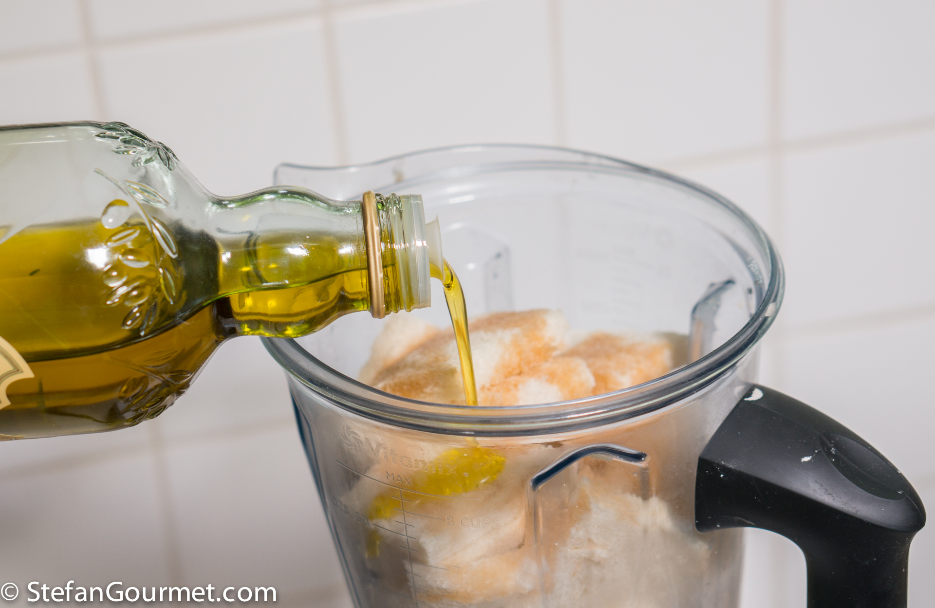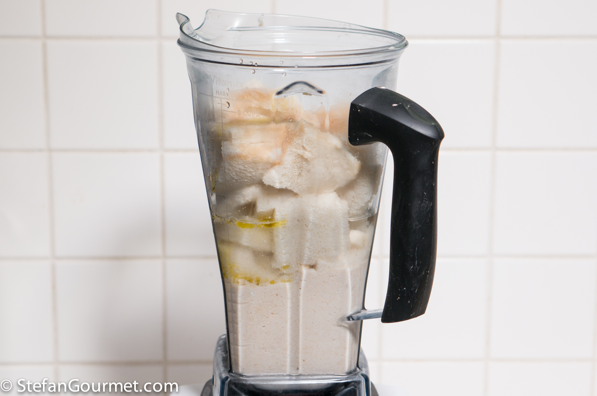 Add the bread as well, and blend until smooth. Taste and adjust the seasoning with salt, vinegar, and olive oil, if needed.