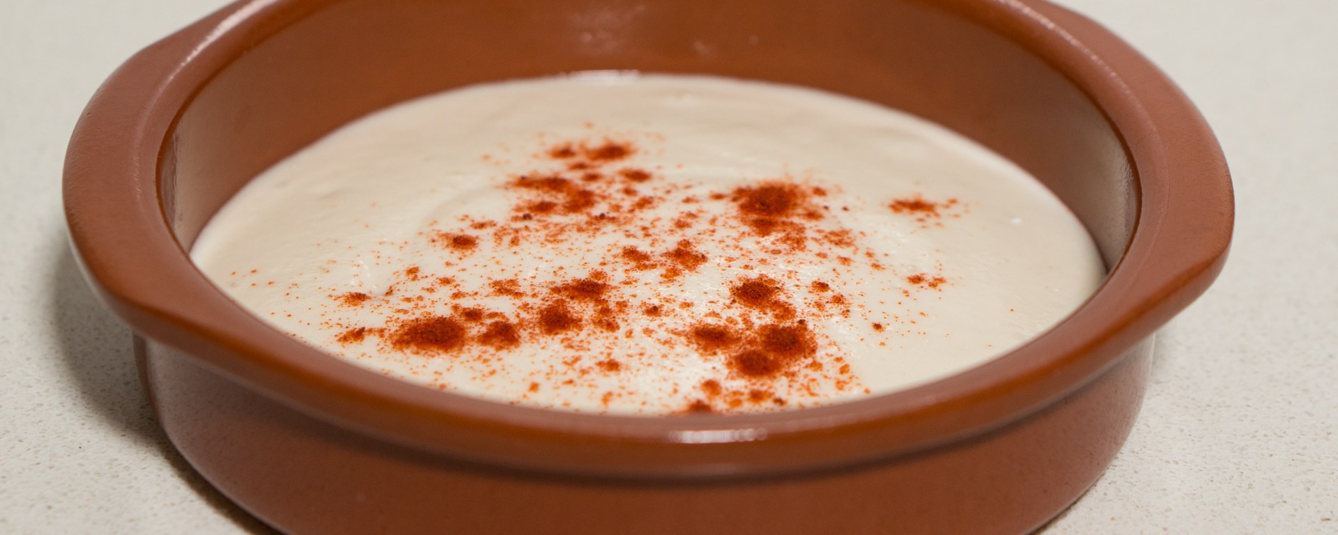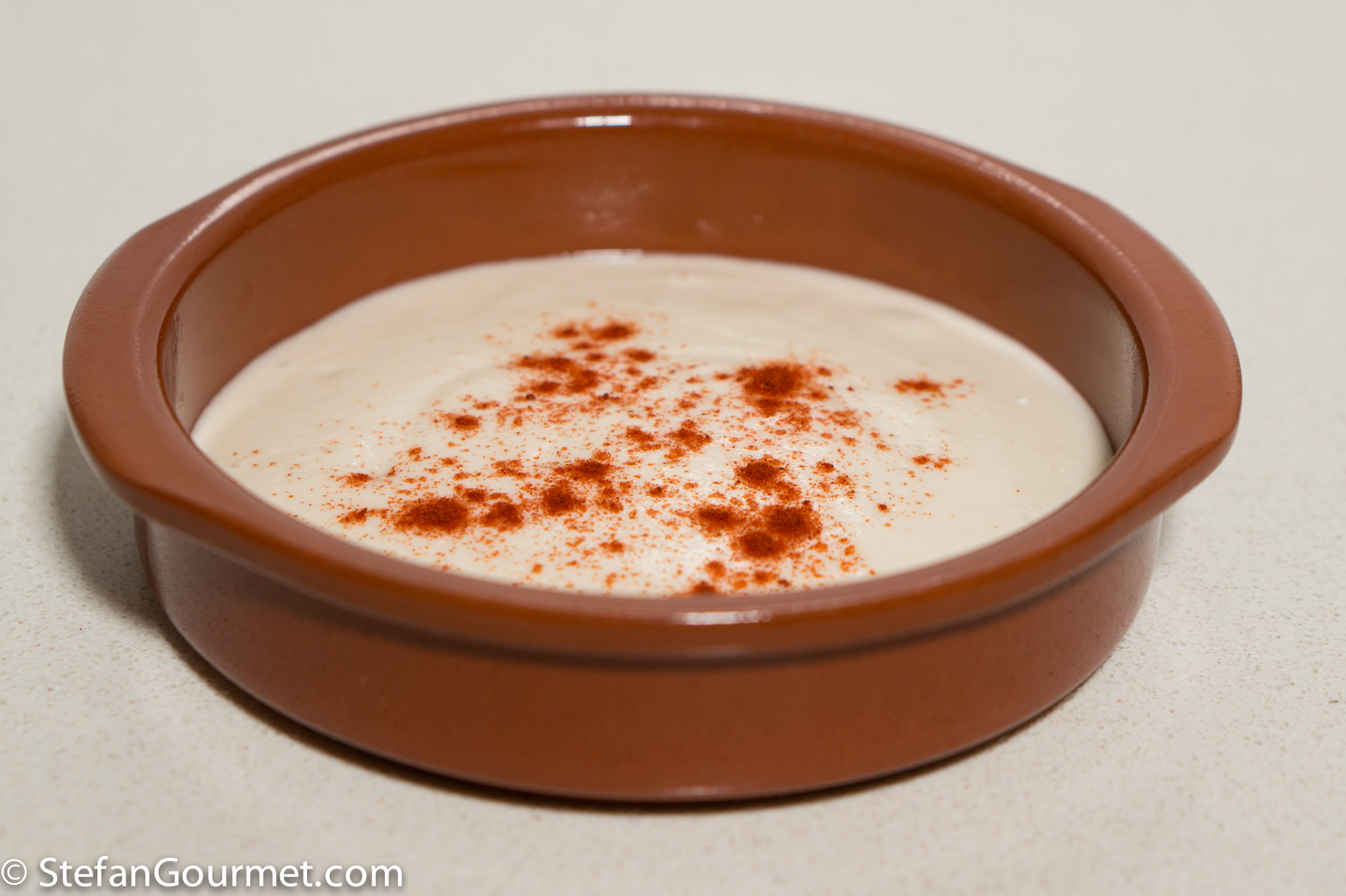 Due to the hot climate, Spain has many recipes for chilled soups. Ajoblanco (or Ajo blanco) one is from the southern Andalucia and a great way to use up stale bread, and quite filling. It is more traditional to garnish it with grapes or melon, but I used some pimentón (Spanish smoked paprika) instead. The smokiness works very well with the soup, and the red color is a nice contrast. To give the soup more flavor, I lightly toasted the almonds, and used a relatively large amount of almonds. For a cheaper (and probably more traditional) version, use more bread and less almonds.