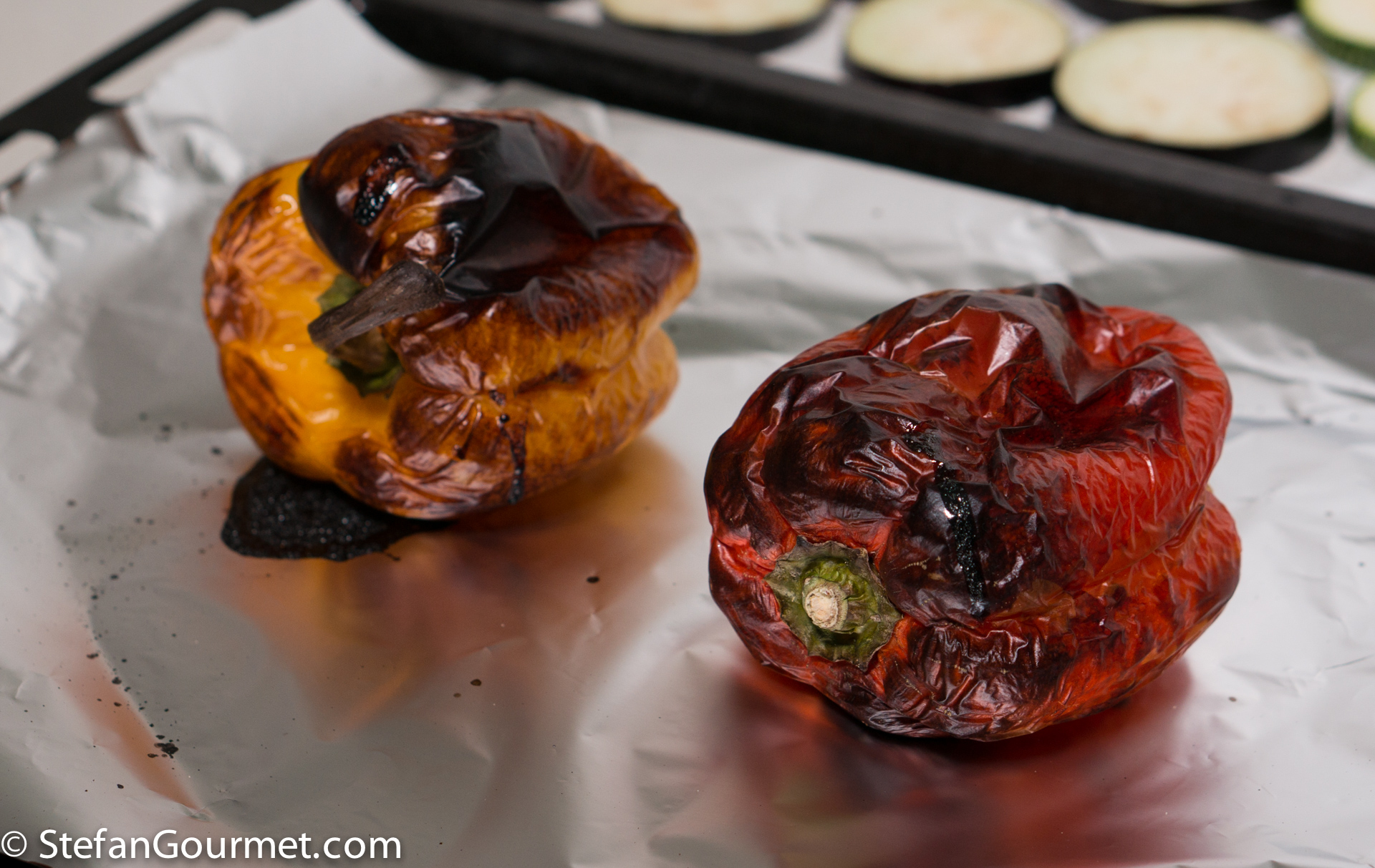 Meanwhile, roast the bell peppers in the oven at 250C/480F until they are blistered all over. Then allow them to cool in a closed plastic bag. This will make it easier to peel them. Lower the oven temperature to 225C/440F.