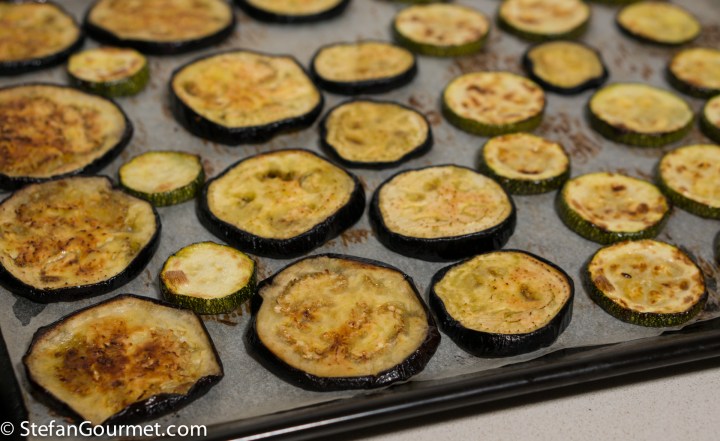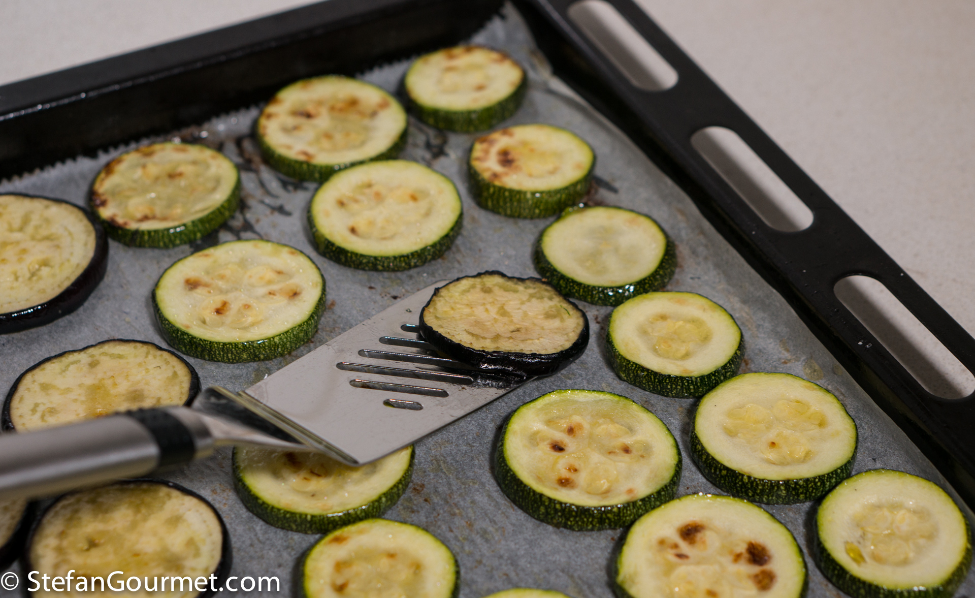 Roast the eggplant and zucchini at 225C/440F until they start to color, about 15 minutes. Then turn them around…