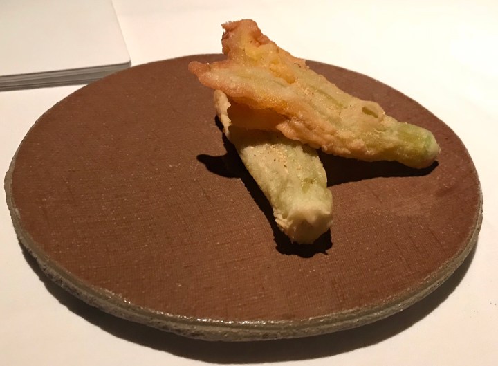 Before the tasting menu started there were some appetizers, to start with fried zucchini flowers sprinkled with ground ginger.