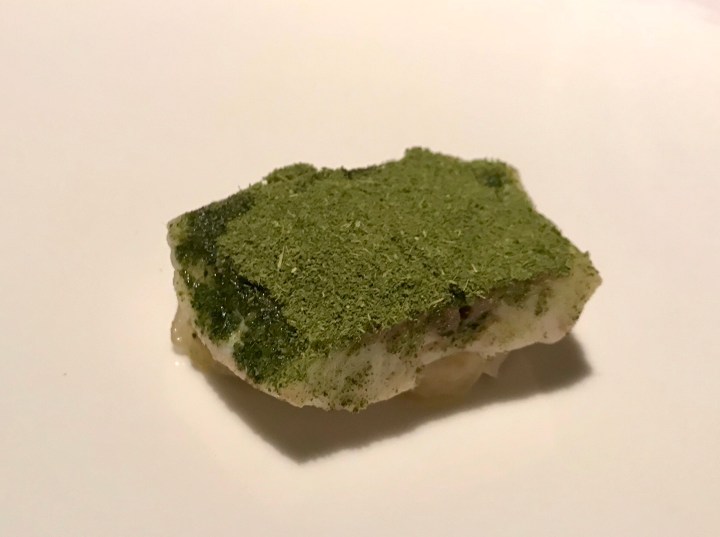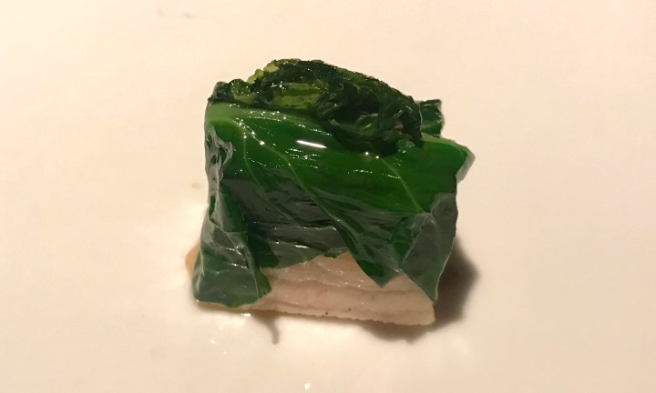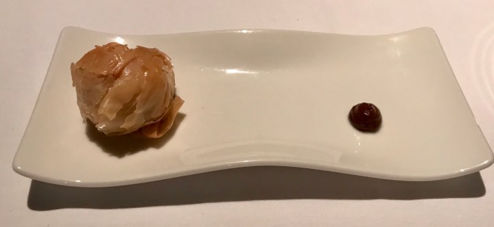 A better pairing with the same rosé was this pork belly with (just a little) honey and covered with chard (more for presentation than flavor). The pork belly was cured and warm but hardly cooked, so more like bacon. 8/10 because of the good pairing.