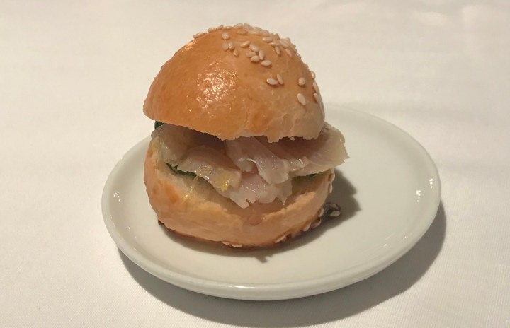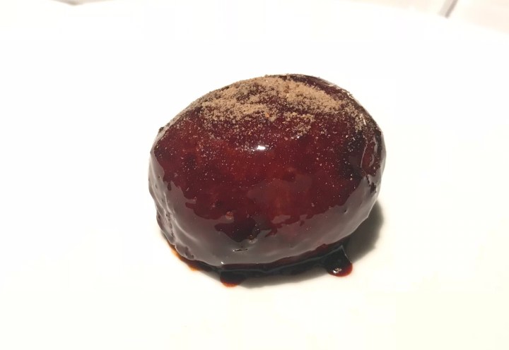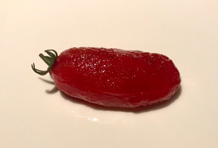 A San Marzano tomato, raw, peeled, with a sauce of green apple and lemon. The tomato was from the farm itself and very flavorful. I think I would have preferred it without the apple and lemon, but it was good. 7/10