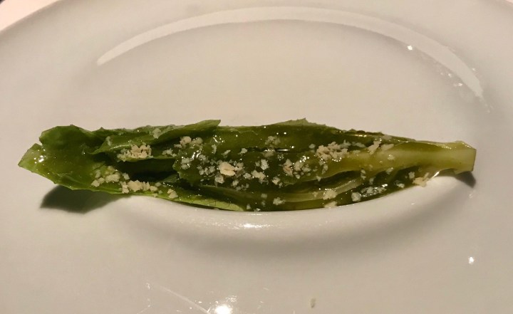 The wine was a perfect match for the next dish: romaine lettuce with a lukewarm dressing of baccalà (salted cod). This dish seemed to be inspired by a Ceasar salad. 8/10 because of the good pairing.