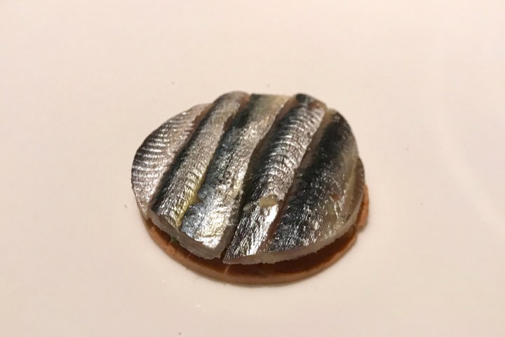 Still with the Grisara: anchovies, almonds, and chartreuse (a herb liqueur), and mint. The mint is what made the dish work with the wine. 8/10