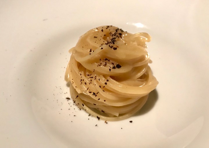 The next dish was quite unusual: thin spaghetti (cooked perfectly) with caramelized citron zest and aniseed. It did work with the same lakes rosé and was very original, but you would not want a full plate of this. 8/10