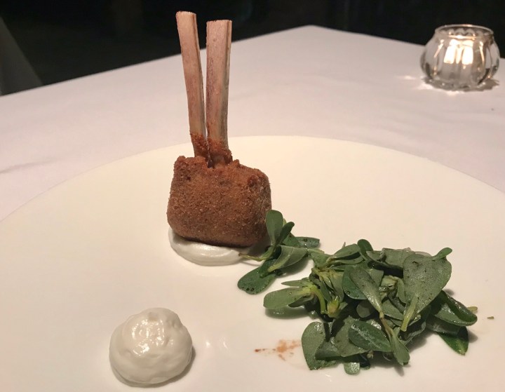 Then two reds served alongside each other with rack of lamb, some kind of mayo, and portulaca (a local herb that reminded me of sea lavender). The lamb was encrusted and unfortunately cooked medium well. Rack of lamb is one of my favorites, but it has to be medium rare. 7/10