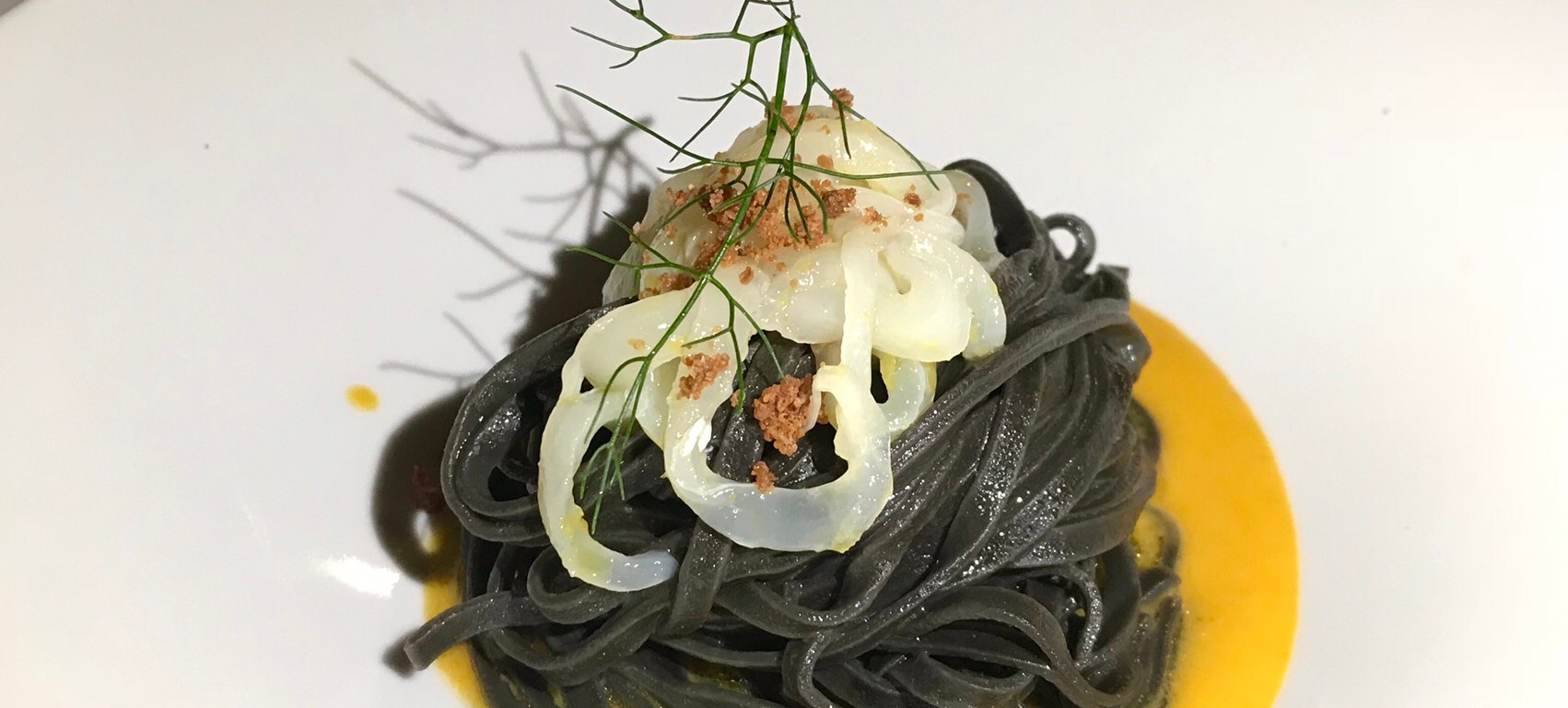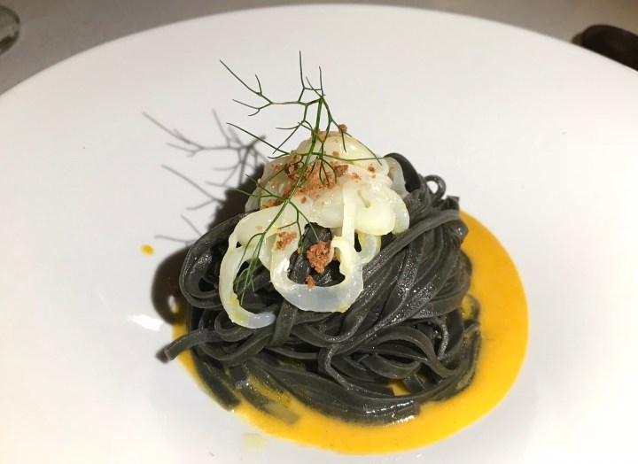 Fresh tagliolini made with squid ink, raw squid, a sauce of yellow cherry tomatoes, and a bit of bottarga grated on top. This dish was perfect and worthy of at least one Michelin star. The pasta had just the right texture, the raw squid was very tender, and the yellow tomato sauce had the flavor of fresh tomatoes, which brightened up and balanced out the dish. Well done.