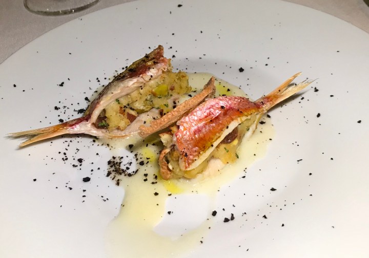 Stuffed red mullet with pistachios and a citrus sauce, with black olive powder. This seemed to me as if it was inspired by sarde a beccafico, a similar dish from Sicily with sardines and pinenuts. It is very difficult to serve red mullet with a crispy skin without breaking the skin, which was done perfectly. I thought however that it was a bit hard to make out the mullet due to the amount of stuffing and citrus sauce. Maybe a bit more salt on the mullet, or less stuffing, would have helped. There were some bones left in the fish.