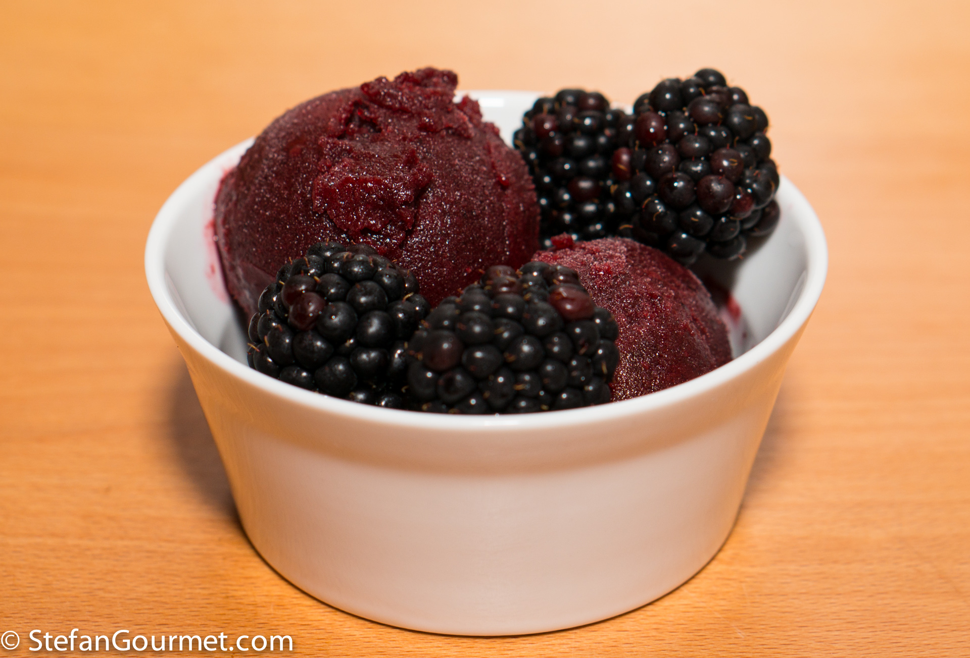 Rosenmuskateller is a rare dessert wine from Alto Adige/Südtirol, the German speaking north-east of Italy. It is made from the rare grape of the same name, related to other muscat grapes but with the distinctive quality that it smells of roses! I thought it would be great to pair this with a dessert that includes rose water, which is flavored water made by steeping rose petals in water. And so I came up with blackberry rose water sorbet, and guess what? It was fantastic. The sorbet by itself because it has an amazing rose scent and the rose works very well with blackberries, but paired with a glass of Rosenmuskateller it was heavenly.
