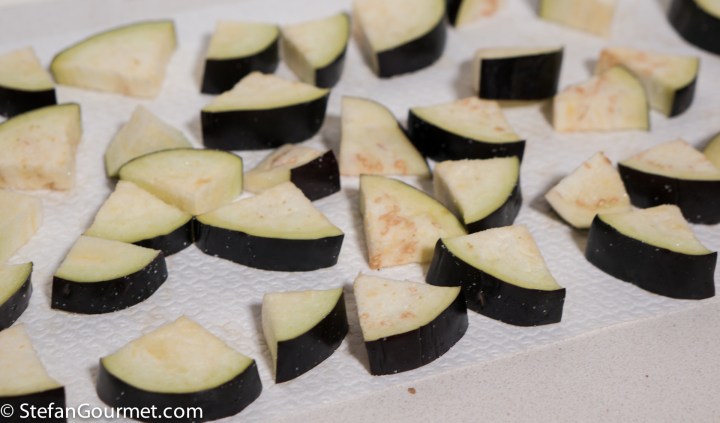 Cut the eggplant into chunks such that the chunks are about the same size and each piece has a bit of skin. Arrange the eggplant chunks on kitchen paper in a single layer, and sprinkle both sides with salt.