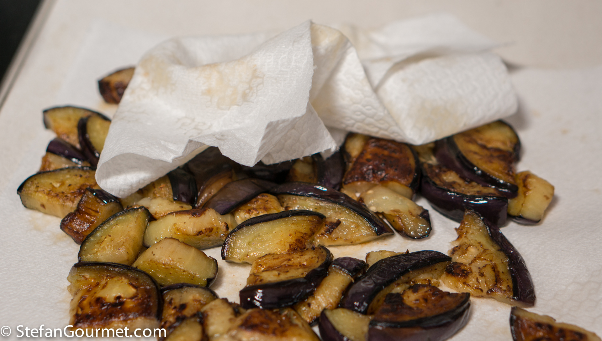 In the meantime, the eggplant should have released a lot of water. Pat the eggplant dry with paper towels…