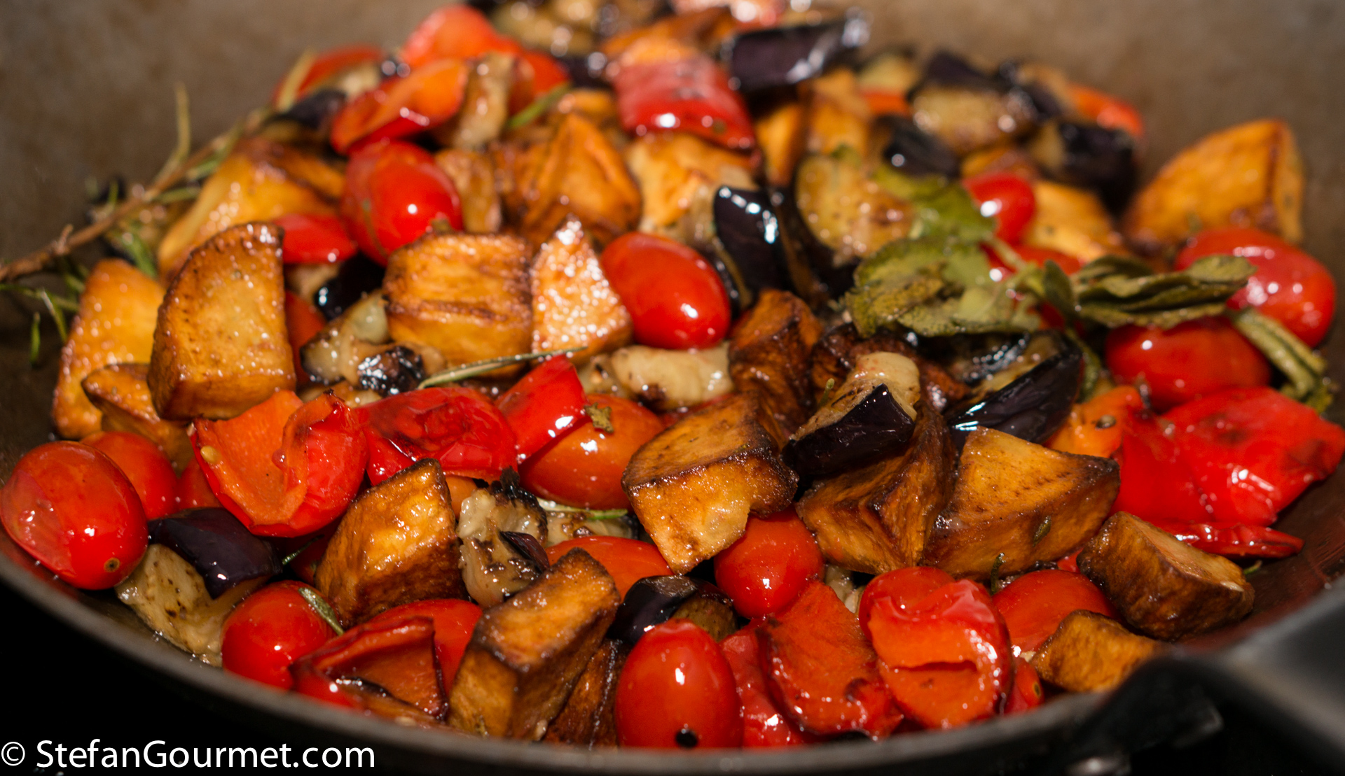 Add the potatoes, bell pepper and eggplant to the pan, season with salt, and stir to combine. Remove the sage, rosemary, and garlic.