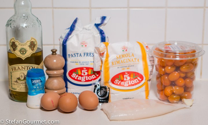 This is a fascinating recipe. Without any seasoning to speak of, the flavors really come from the pasta, the tomatoes, and the squid. Fascinating.