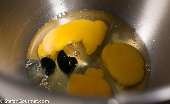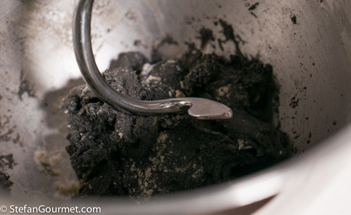 To make the pasta, combine the eggs with the squid ink in the bowl of the stand mixer.