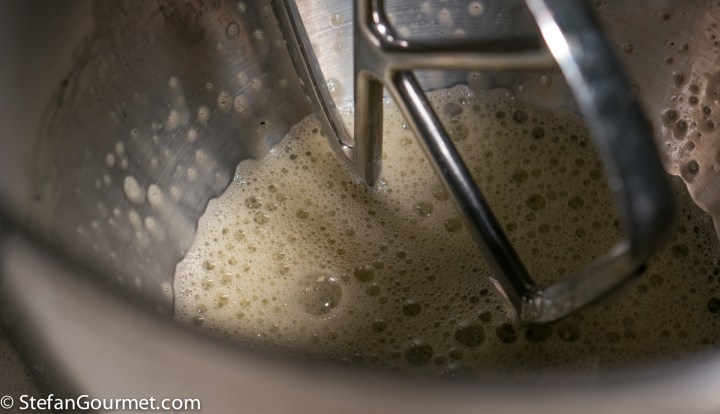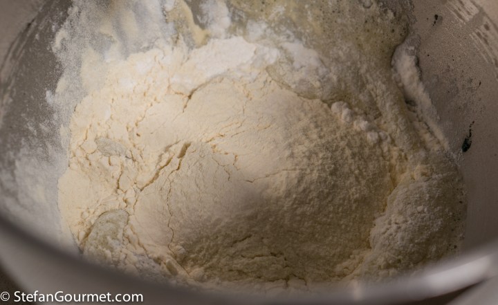 Now add the flour, and mix with the paddle attachment until it comes together. You may need to add some water or flour; click here for a full explanation of how to make pasta dough with a stand mixer.