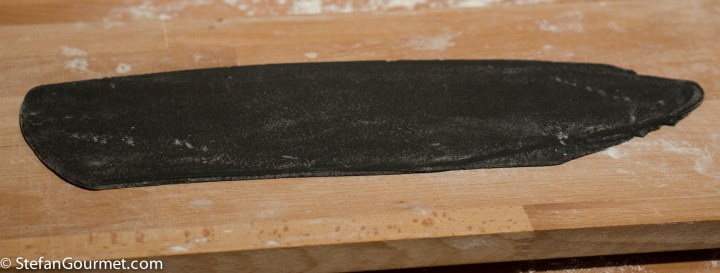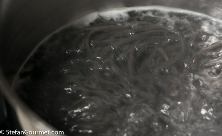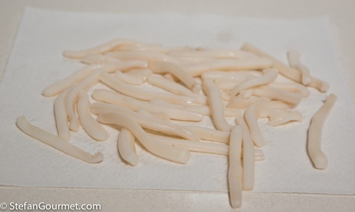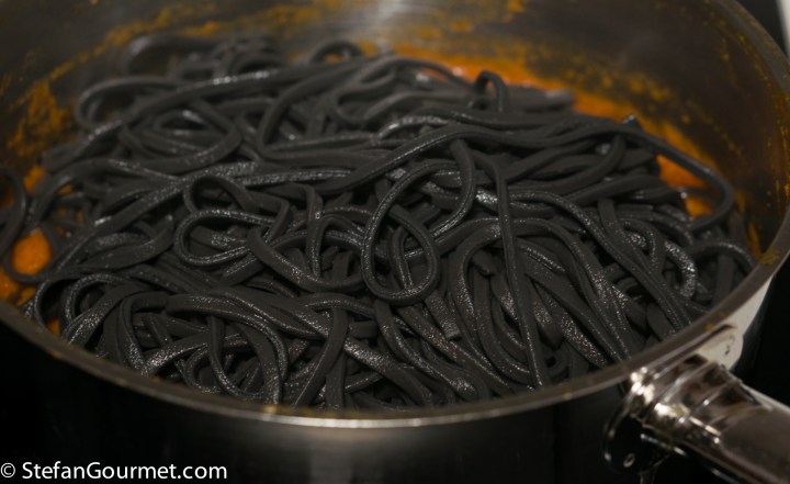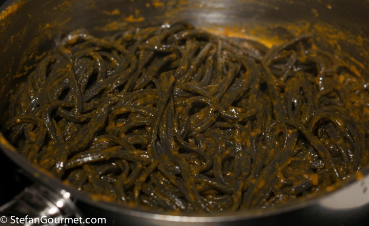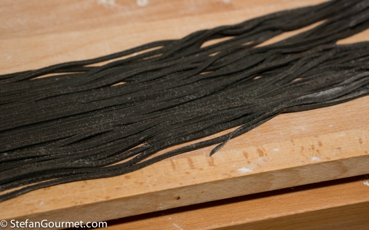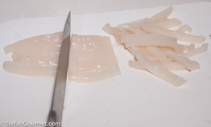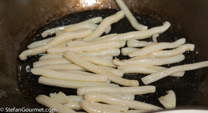 While the pasta is resting, slice the squid into thin strips (thinner than I did on the photo).