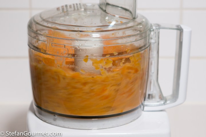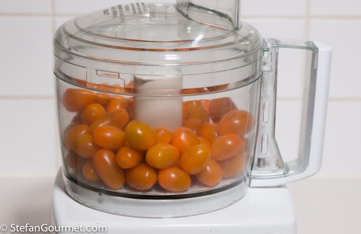 To make the tomato sauce, put the yellow cherry tomatoes in a food processor…