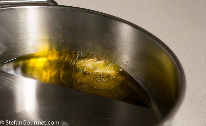 Heat 2 tablespoons of extra virgin olive oil in a frying pan. When the oil is hot, add a clove of garlic, peeled, and thickly sliced, tilt the pan, and cook the garlic until it is golden. Discard the garlic.